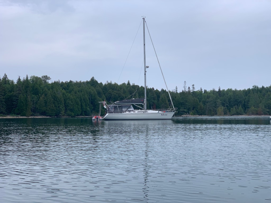 There are few anchorages along the coast of lake Huron, and we had to stop most nights in marinas along the way. Thats ok, but we were now determined to be on the hook for an extended period of time. We arrived in Cove Island Harbour, a small very well protected anchorage across the channel from Tobermory about 5:30 pm. Its a very narrow path into the anchorage and we kind of expected to find it empty, but of course no such luck. Two sailboats and a large trawler already filled 75% of the available space. We tucked into the anchorage and set the anchor for the night. Then a very nice C&C 50 arrived to make it 5 in the small anchorage for the night.