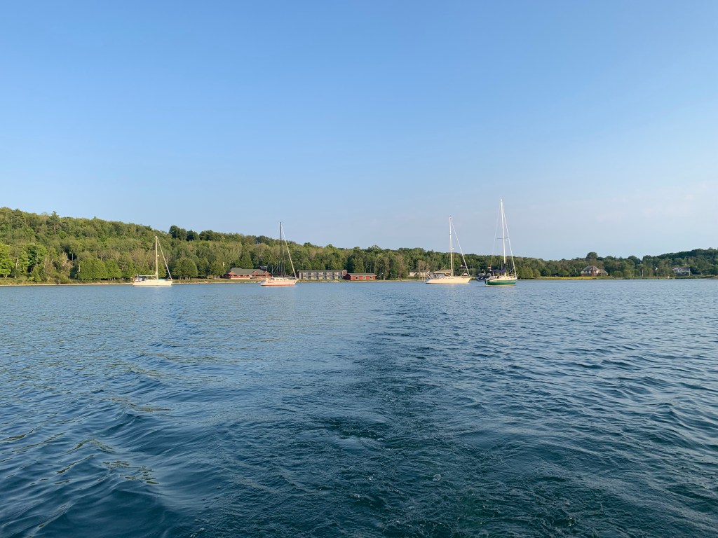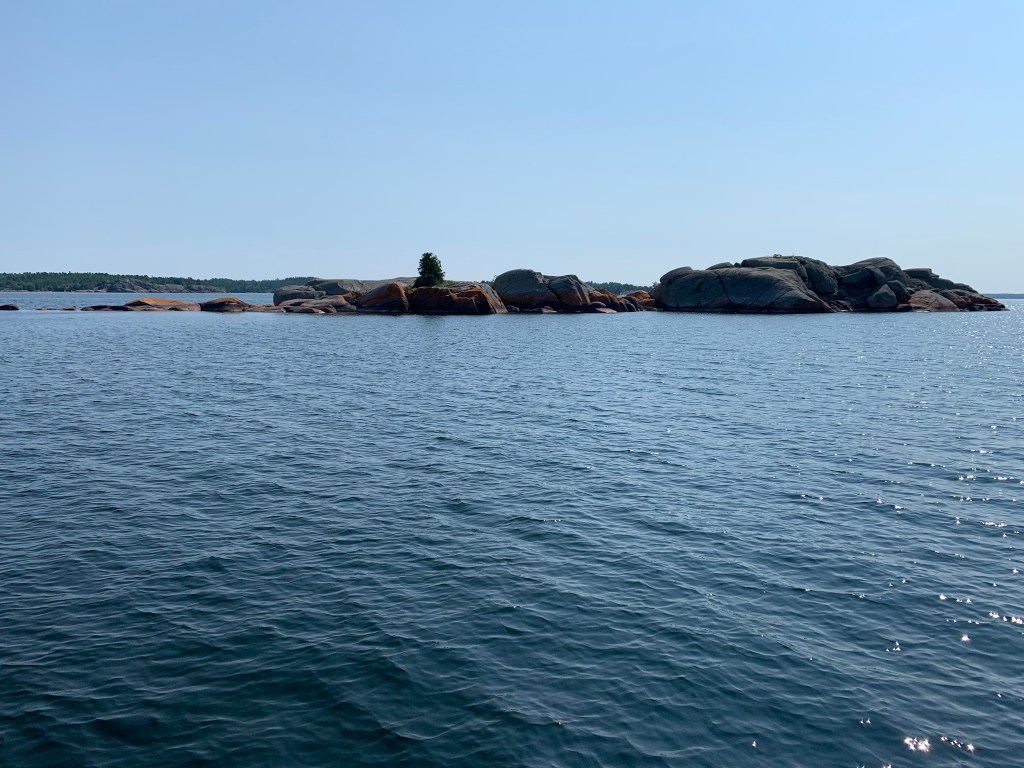 Early the next morning we left Gore Bay and headed North East toward the Benjamin Islands. It was another glorious morning with a slight breeze. We sailed for a little until the winds died. Motoring, we took a path South of the Benjamins but North of Clapperton Island to get a closer look at the various anchorages around here. 3 sailboats were leaving the south west anchorage as we rounded the point. Probably getting out of there before the strong SW winds were starting that evening. Dave took the boat through the Sow and Pigs shoal, as I was on the bow looking for shallows. Going right between the 2 largest rocks from West to East is ok if you watch your charts and have a bow watch. Turning north we got a good look at the anchorage on the East side which would give enough protection for the forecasted winds, but it’s also popular. Quite a few boats were anchored, and while there would probably have been space, we enjoy solitude more – so we continued on to Fox Island’s North East shore.