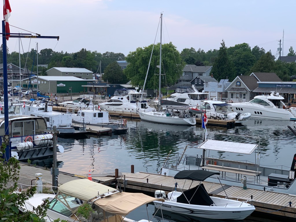 On the last night our friends had arrived around 10pm from Peterborough – they are not retired yet so had to get that work thing out of the way first. Of course, we had to celebrate finally being able to hang out together, so we didn’t hit the bunks until 2am and probably made a major dent in our weekend supply of beverages. No one stirred until 10 am the next morning although the town was already bustling with life. It had started raining so we took our time with a leisurely French toast a la Dave breakfast. By 11:35am we felt we really should move as the docks were filling up with motor yachts who needed a dock and entertainment while it rained. We did a quick stop on the way out to get pumped out and then motored in the pouring rain to Cove Island.