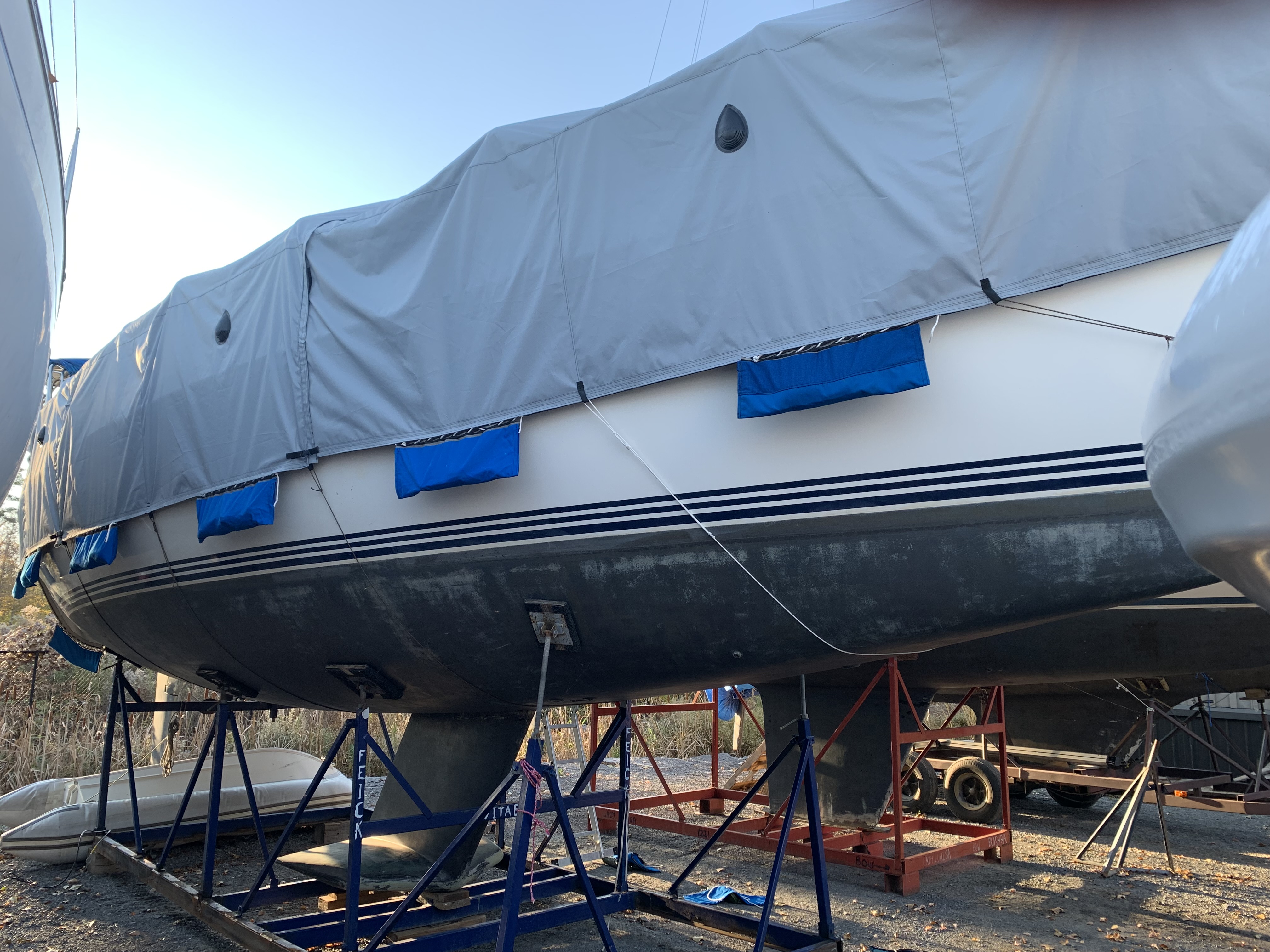 Vitae originally came with an Aluminium structure for a winter cover, when we bought her in November 2016. The cover itself was apparently in shreds and we never saw it. Instead huge tarps were used. So for the first few years that’s what we did. It was a rather frustrating experience as the tarps would inevitably break, slip or even slap against the hull leaving marks. Every winter we’d have to go up to the yard where she was stored and try and adjust tarps with frozen fingers. I hate cold hands! In the last 2 years we broke down and had her shrink wrapped just to save the boat from all the snow and ice. Not feeling very good about the environmental impact of all the useless plastic we vowed to get a proper fitting cover we could use for many years to come.