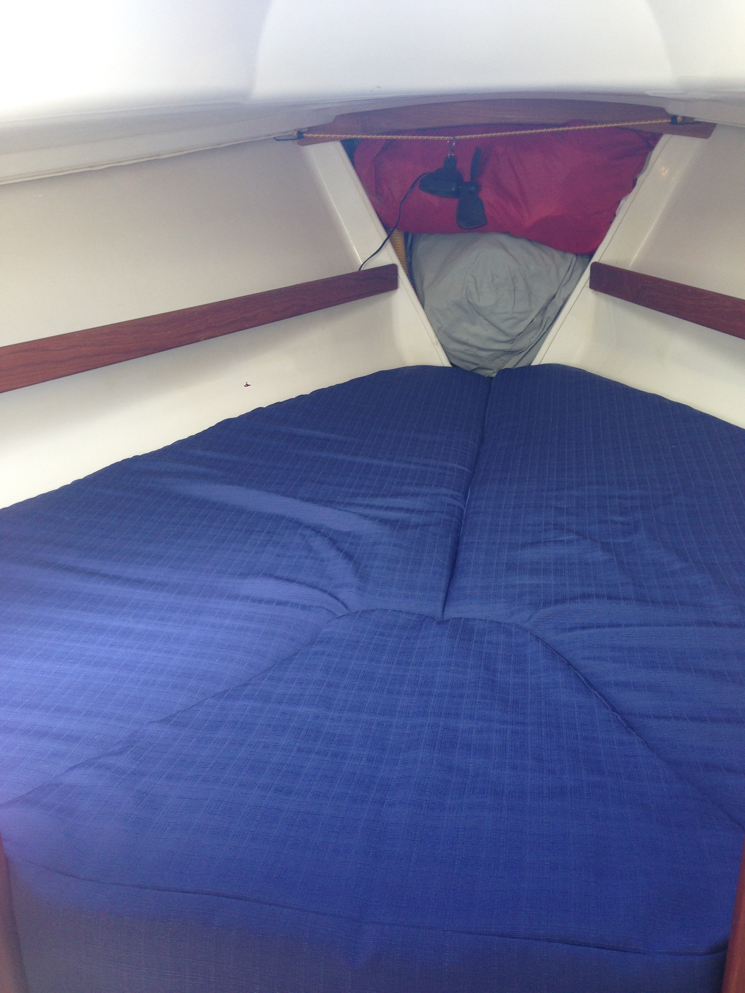 - Top Gun is not the lightest material but we needed the cover to be manageable – so we decided to make the cover in 3 parts to make pieces manageable, easier to fold and store, and also be able to sew openings for mast and stays next fall