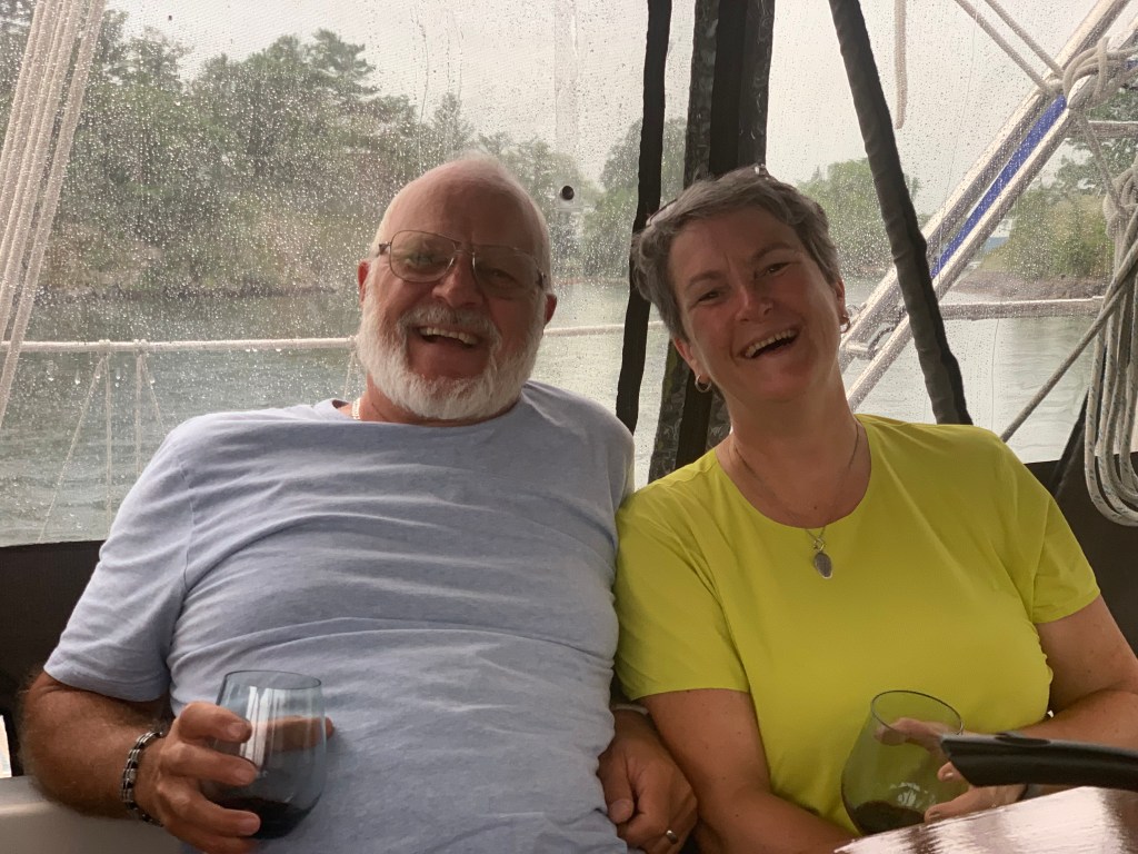 Another highlight was our meet-up with Frank and Marie-Claude from Komeekha. You can read how we met them last summer in the North Channel. We had stayed in touch over the winter. David and Frank exchanging ideas about the new Raymarine Chartplotter installation and other improvements Komeekha had made to get ready for her big voyage out the Saint Lawrence and south. They had come all the way from their home port Owen Sound, and we really wanted to see them on their way through the Thousand Islands. They arrived around 2pm and quite expertly anchored beside us. It was so great to see them and wish them well. We had a fabulous dinner with all 6 of us on board chatting about their travels so far, comparing notes on equipment and preparation and what route they are planning to take. Rob and Monica have done the trip out the St. Lawrence and south before so they had lots of useful advice for Frank and Marie-Claude as well. We would have talked all night but eventually they had to get to bed as they were going to go through Iroquois lock the next day. We hugged them good bye and will be following their journey closely, as we intend to sail south next year as well.