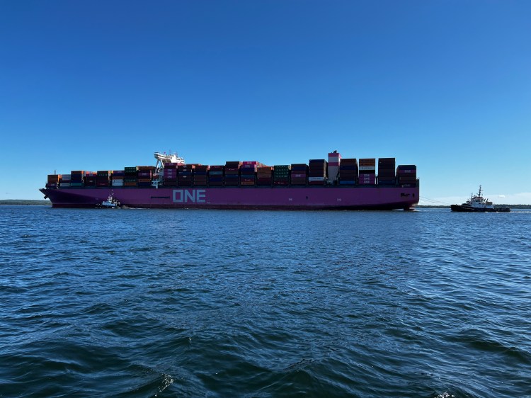 We had a beautiful easy morning in early August, with perfect wind and hoisted sails right away. Our son, Evan was joining us on this leg of the trip from Halifax to Lunenburg, where his girlfriend Kare was going to meet up with us and spend another weekend. We sailed out of Halifax Harbour with light winds along the south western shore following Mimi Jane, a beautifully newly built 51′ steel yawl, (a replica of the tuna fishing dundees found in northwestern France) designed and built by Murielle and Mark. We had seen this boat last year while in Brockville,ON at the Tall Ships Festival. Halifax Harbour control was hailing us both on VHF at one time to let us know a large ship, the Orion, was leaving harbour and would be crossing our path. It was loaded with wind turbine bases.