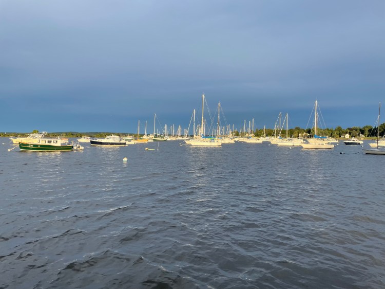 Approaching the entry to Old Saybrook, the sky turned darker and darker. We had the sail furled in and then a squall hit just as we entered the mouth of the river. It was hard to make out the narrow entry past the break wall. AIS showed that another boat was about the exit so we slowed up to let them come out before we entered. Once inside the break wall the waves calmed substantially and the squall died down. We saw some very ritzy big power yachts going by the Saybrook Point Marina and then we turned to port and into North Cove. Navionics showed that the cove was really too shallow for us except the dredged out mooring basin in the middle. There were 4 or 5 rows of at least 10 boats moored. We slowly went through the middle of it looking for a free ball with a yellow ribbon as those were supposedly open and free. We couldn’t find one but were able to grab an empty mooring on the south side amongst some smaller boats. At least this was a temporary stop until we could figure out the lay of the land. We hopped in the dinghy and explored the west shore, stopping at the North Cove Yacht club (where we saw no-one) and then the town dock. Here we learned from a sign at the town dock that the 3 closest mooring balls belonged to the city and were free for 3 days. That’s what we were looking for, but how shallow was the water here, and there was still a 3′-4′ tide.