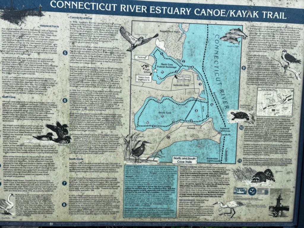 We really enjoyed going for runs along the town streets, shopping at Walt’s Food Market on Main St. or taking the dinghy up into the reedy shoreline along the north part of the bay. The photo of the sign below shows this area as the Connecticut River Estuary Canoe/Kayak Trail. The star marks the town dock at Sheffield St. where we were anchored. Provisioning was relatively easy walking to a Stop & Shop Grocery Store and a Wine and Liquor store.