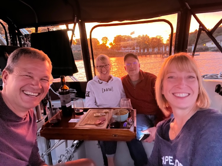 It was great having our friends Paul and Karen join us on the boat for dinner the first night and then being able to go for a hike at the Devil’s Hopyard State Park, which was a little further inland. Their son Ben, all grown-up now joined us as well. We hadn’t been in a car in a while, so even the drive there was a highlight. We ended up at their house in Colchester after and at a little local pizza dig for dinner. Of course we enjoyed way too much great Connecticut pizza. What a fun visit, but way too short!