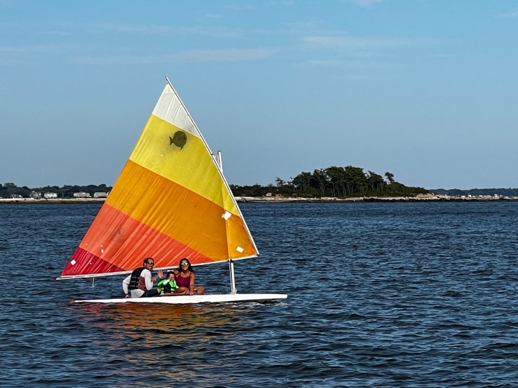 It was already early afternoon and we did not end up going far as we were heading into the wind and current. We stopped at Duck Island by Westbrook. It’s a most unique anchorage as the small island sits to the left of the entrance to Westbrook harbour. It makes up part of the break wall that protects the harbour entrance and has another break wall on its west end which runs perpendicular to the first one. The island is an important bird sanctuary especially for snowy egrets and creates a relatively sheltered bay in front of the harbor. There were numerous little boats anchored in its shallow waters on this warm sunny afternoon. Most of which left as the sun set. It was a little rolley but a convenient stop and we took the dinghy briefly into the town dock at Westbrook to get rid of our garbage.