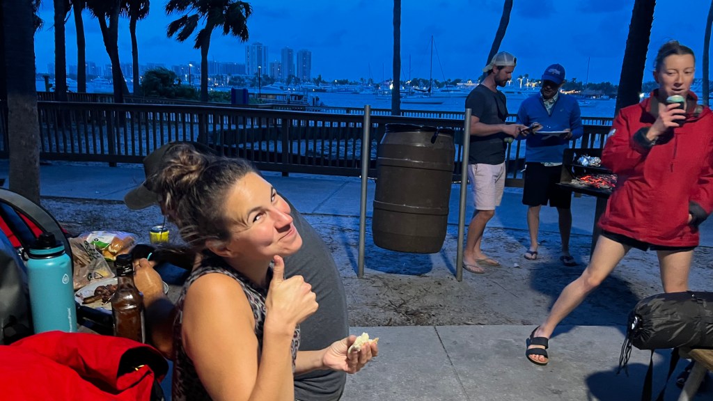 Our group had grown even more as Dominique and Yannick on Laloup had pulled into West Palm as well. There was no way we could all get together for Christmas on one boat, restaurants would be too expensive, so we needed a place to have a potluck. What better place to do it than Peanut Island. But you weren’t aloud to drink alcohol on the island and you would have to leave at dusk. Mmmh! However, if you rented a camp site you could stay as late as you liked, you could have a fire/bbq and you could have alcohol. Perfect! And of course, there was lots available for the 25th, because who in their right mind would go camping on Christmas?!