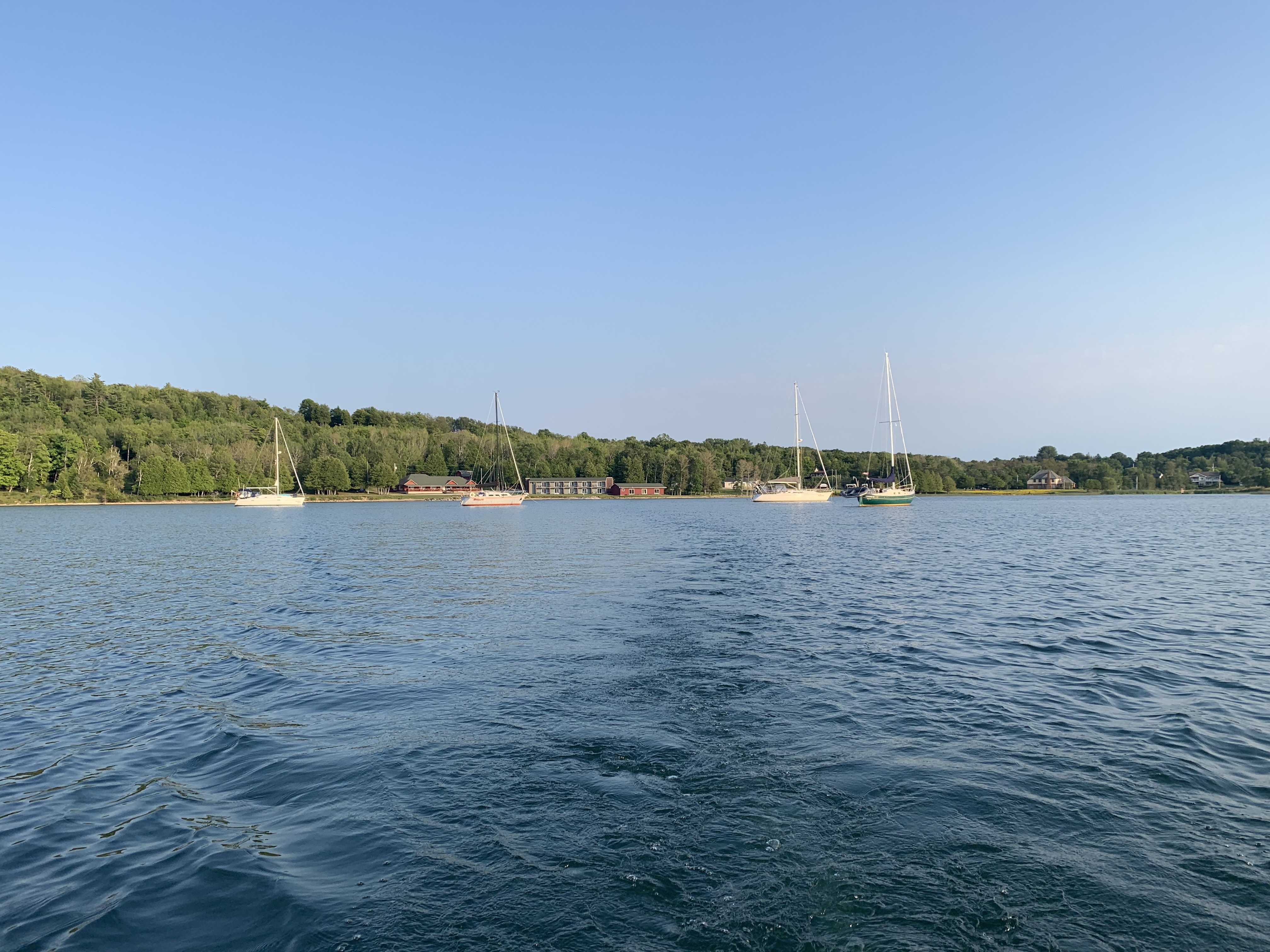 With a steady N/NE wind we headed West at 6 knots with just the Genoa. By 1pm we pulled into Clapperton Island’s Southern Bay, a large bay with a small island inside. It offers good protection from most wind directions but can get a bit wavy in strong West or SW winds. 3 sailboats were already anchored here, but there was plenty of space to swing. We tucked in behind the island on the North East side. The island has an abandoned and dilapidated lodge on it, but since it’s private land, one would need permission to land and explore.