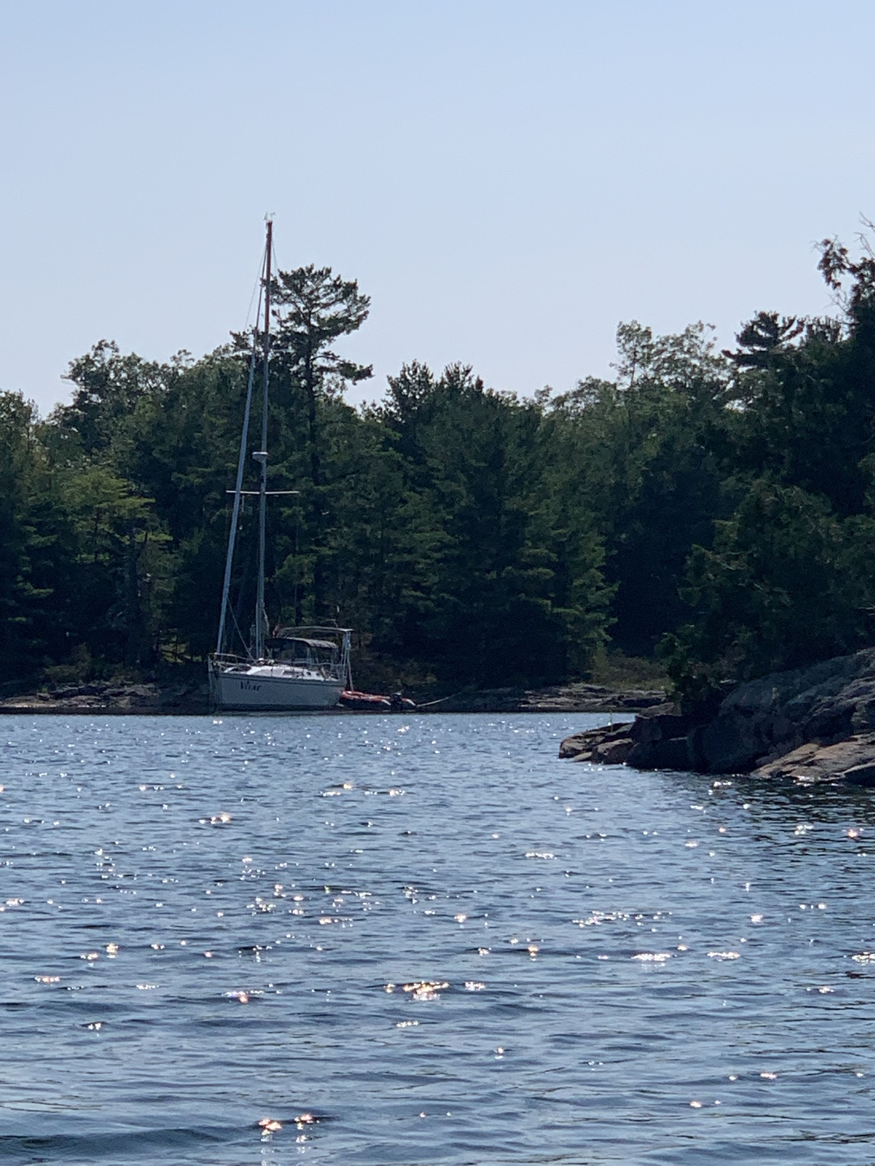 We went below to clean up and when we came back on deck, noticed that “Gaviidae” had pulled in beside us. We hailed them on the VHF and they invited us over for drinks and snacks boat style – bring your own beverage, glasses and a snack to share. Once on “Gaviidae”, Julie and Dan introduced us to Marie-Claude and Frank from “Komeekha”. We had so much fun together, we decided to stay another day in the same anchorage with them. Frank was invaluable in coming over to our boat and helping us analyze some of our electrical issues with the VHF and gave us suggestions on how to update our Raymarine electronics.