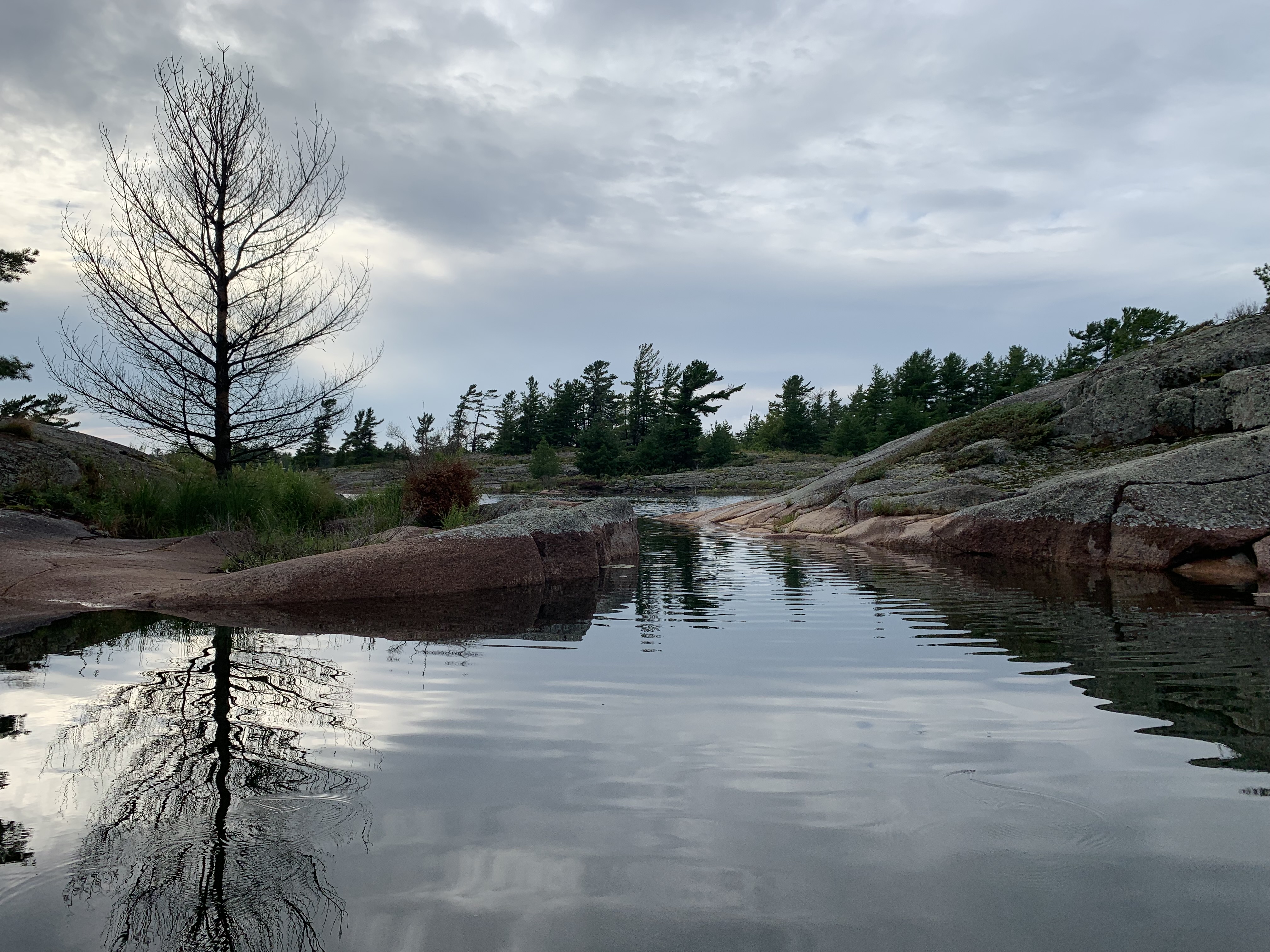 As we got there early and it was still beautiful we assembled our fold up kayaks and paddled past the little shoals and islands to the North for a couple hours. Also chatted with our trimaran neighbours, a couple with their teenage son, who had trailered their boat up and were out for just a short trip. I felt for them the next day as it rained until dinner time and they didn’t have a lot of room for 3 below deck. Luckily, it did finally clear and we took a dinghy ride around the island. What a great place. The South West bay is like a bunch of fjords with rounded, sloped rocks and shoals. We took the dinghy into the bay and it was like a maze. A couple of times we bumped into rocks and had to pull up the motor to paddle the boat through. The video below give you a better idea of the beauty of this place.