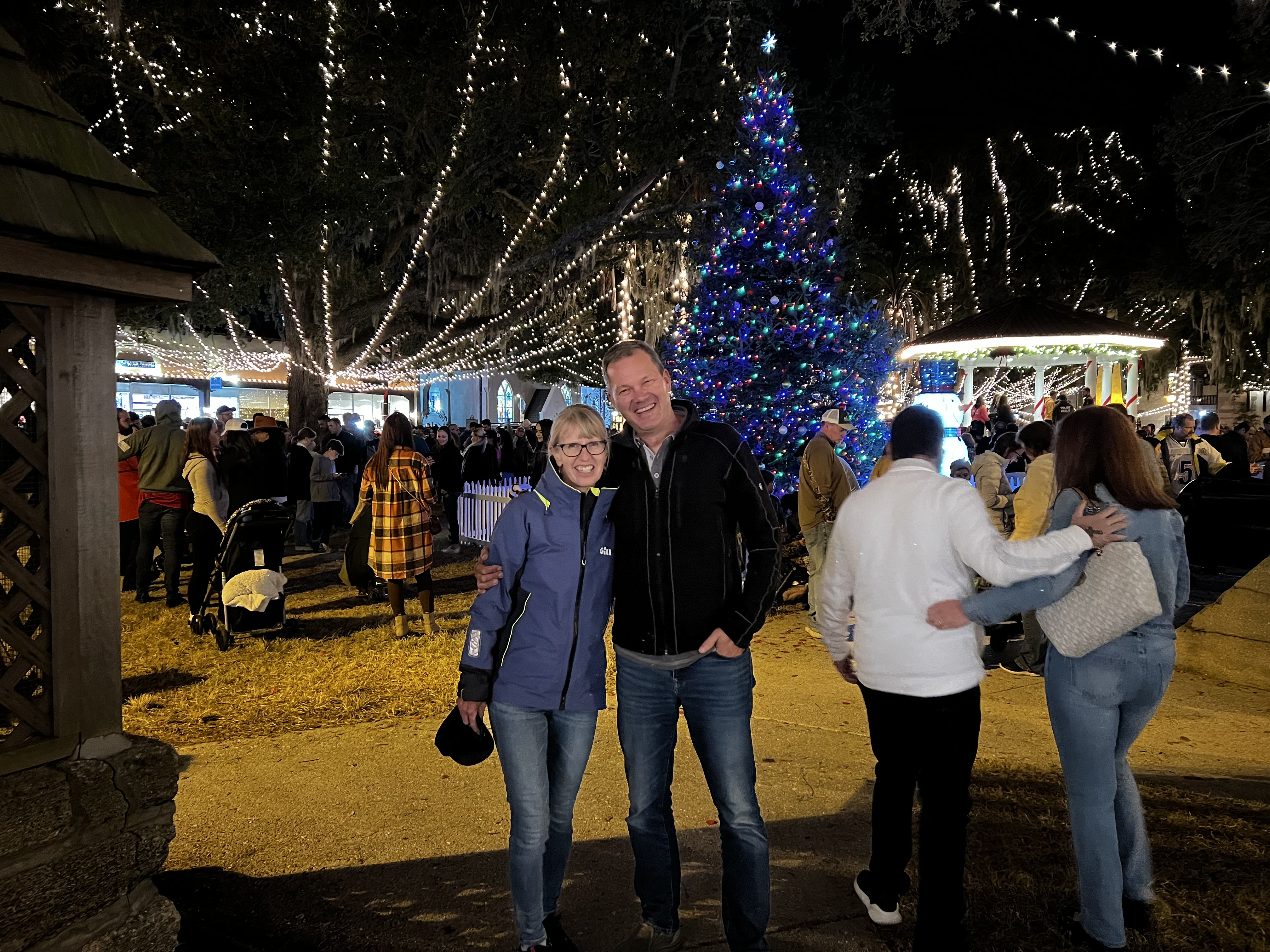 The next day was a much easier travel all the way to St. Augustine, despite the 7 bridges we had to pass under (they were all around 65′ high, so no problem for our 61′ air draft). We were even able to sail part of the way and anchored right in front of the fort Castillo de San Marco downtown historic St. Augustine. The town was all a sparkle at night with Christmas lights and a beautiful sight from the boat. We enjoyed the scenery with a nice dinner on the boat and went to bed, ready to explore this fun town the next day.