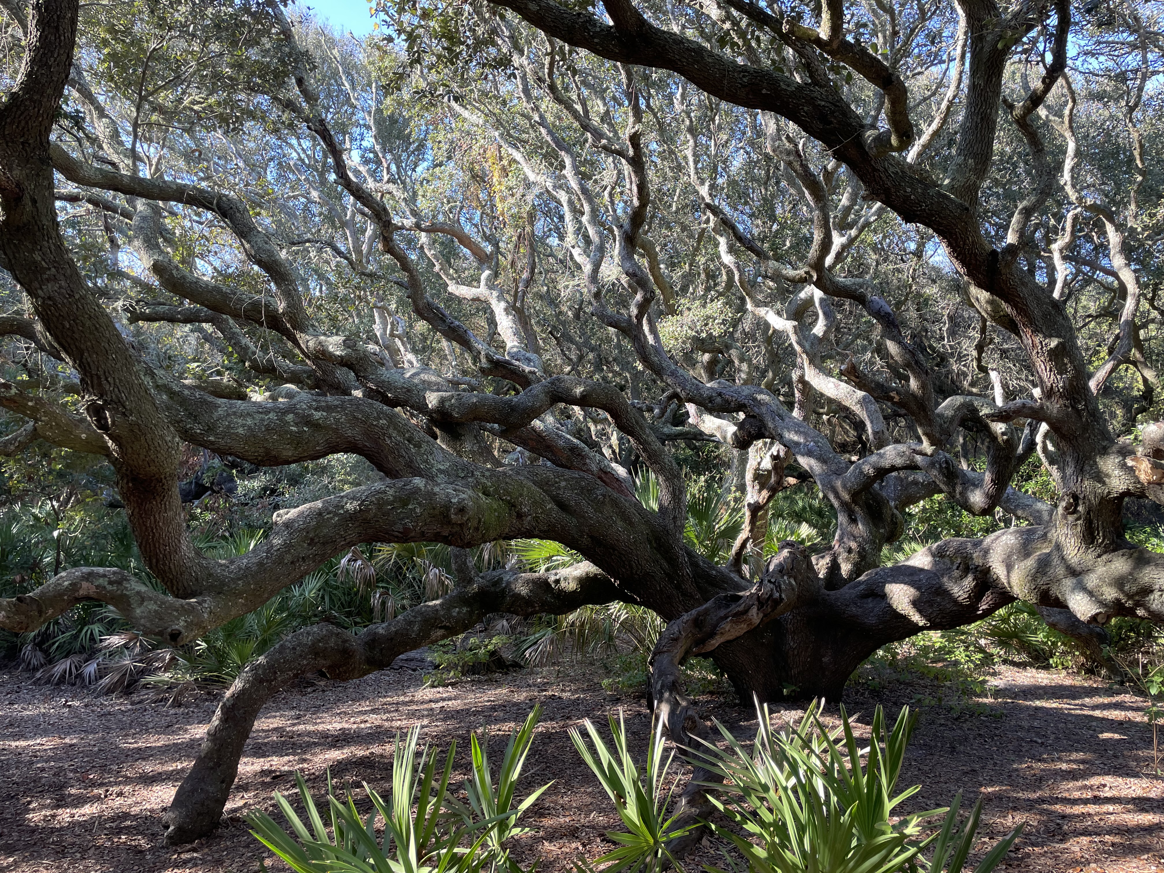 Jekyll Island, another barrier island, is a vacationers paradise of paved bike trails, sand dunes, miles and miles of wild beaches next to historical mansions, tons of history mixed in with resorts, hotels, a golf club and nature preserves. We took a couple days to explore and thoroughly enjoyed cycling the quiet island, which I am sure is much busier in the hight of summer than in November. We were here just before the American Thanksgiving and watched as they were busy decorating the parks and historic district with Christmas lights. So strange to see palm trees and oaks covered in Spanish moss with twinkly lights! Wish we could have stayed until Nov. 24 when they finally turn them on, it would have looked spectacular (350+ Light displays and 45,000+ lights on the big tree). It’s interesting that this island became an exclusive club for the rich and powerful in the 1800s. Families like the Rockefellers, Vanderbilts, Pulitzers, Bakers and Morgans spent their summers here in elaborate “cottages”. They are being lovingly restored and some can be rented for private functions.