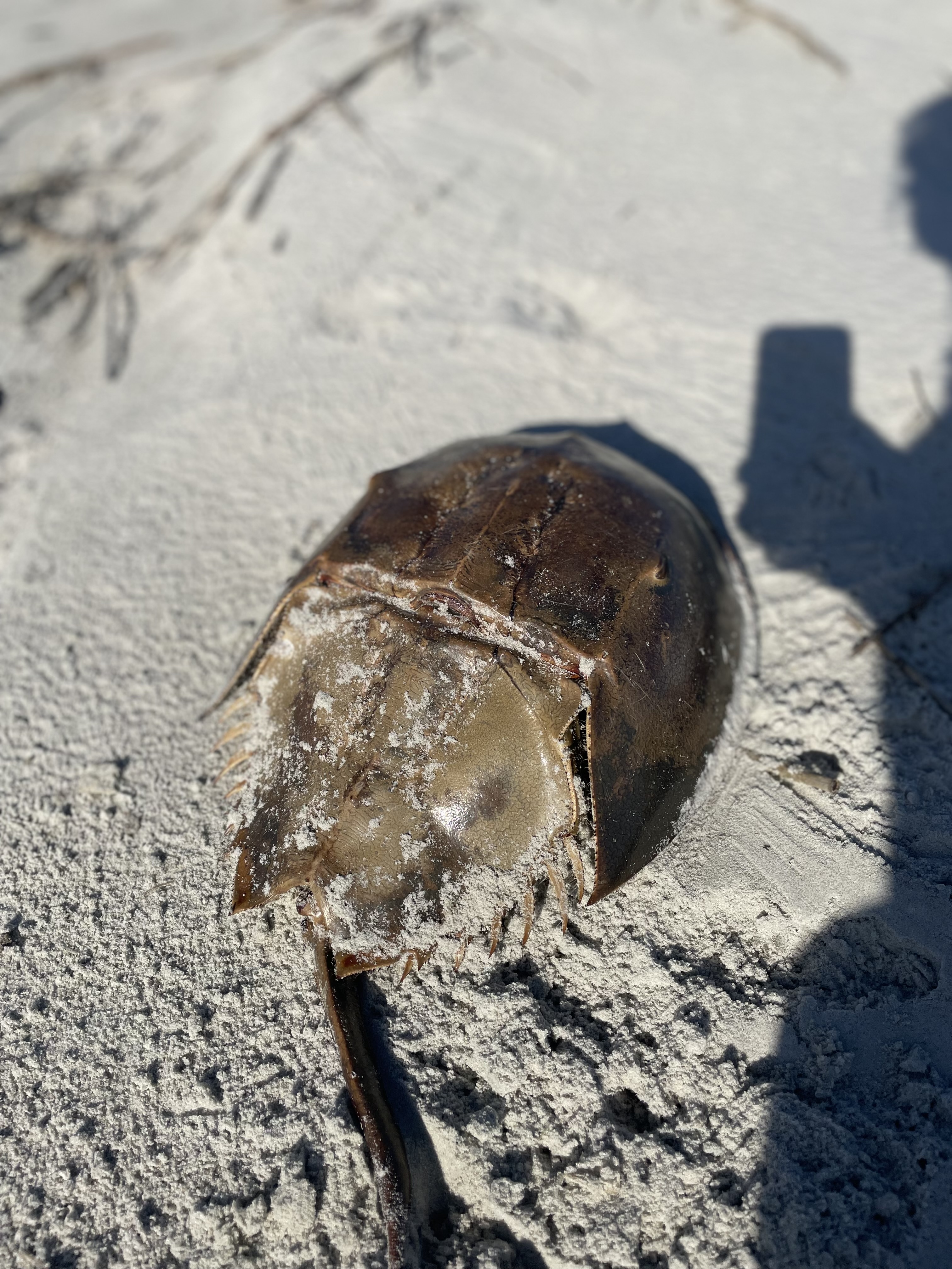 They were all over the beach and the size of a soccer ball or even larger. They truly looked like something prehistoric and kind of creepy. We did think they must be some kind of crab and after asking about them found out that they were indeed Horseshoe Crab carapaces. Horseshoe Crabs are more closely related to the trilobites of 544 million years ago and have been around since before the dinosaurs 300 million years ago. They live in the Atlantic as well as in the Indian and Pacific Oceans and shed their carapaces or molt many times as they grow into adulthood. Their life expectancy is about 10 years and they can be found as far north as Maine. Funny, we never encountered them before on our trip down the east coast.