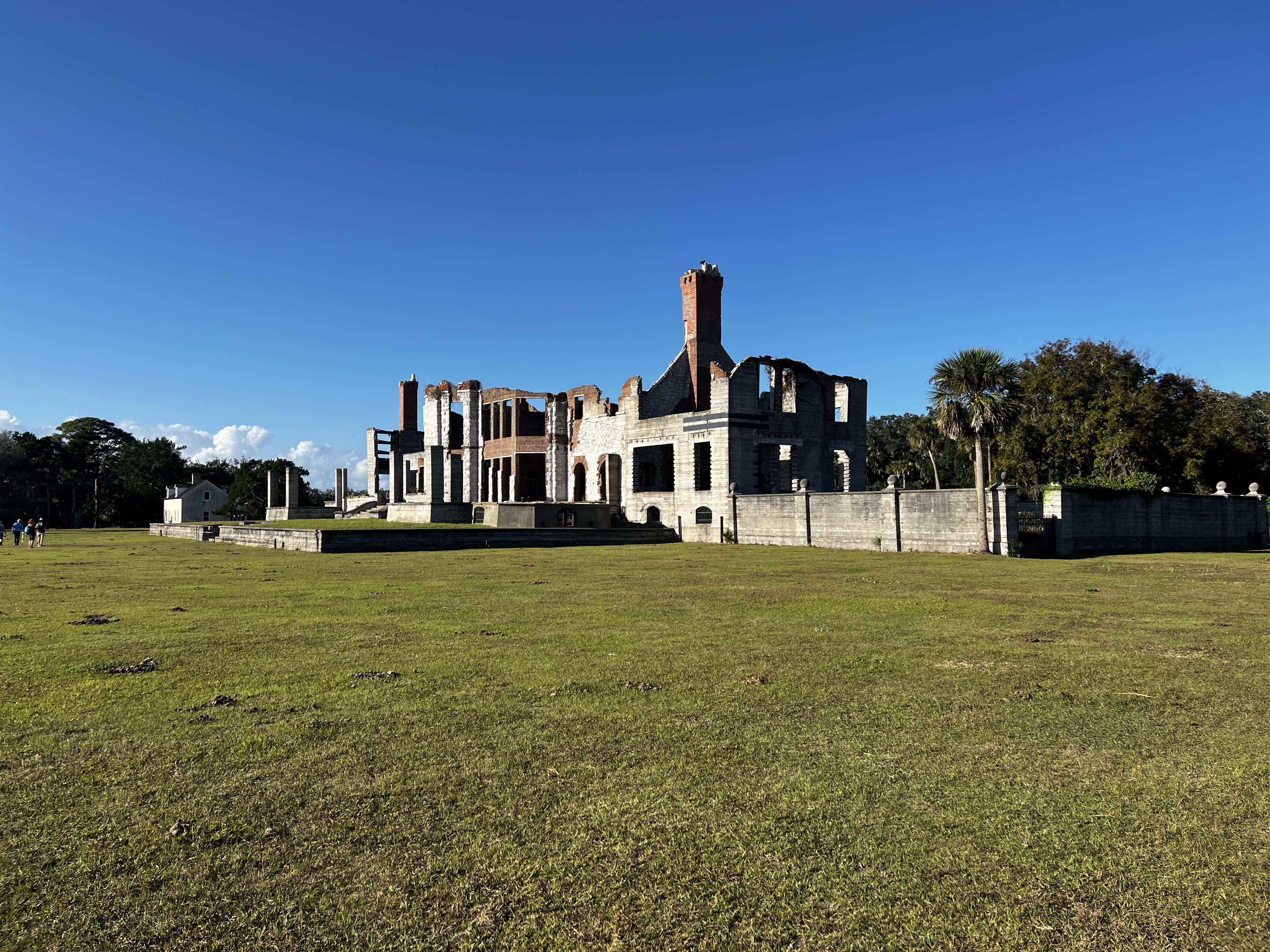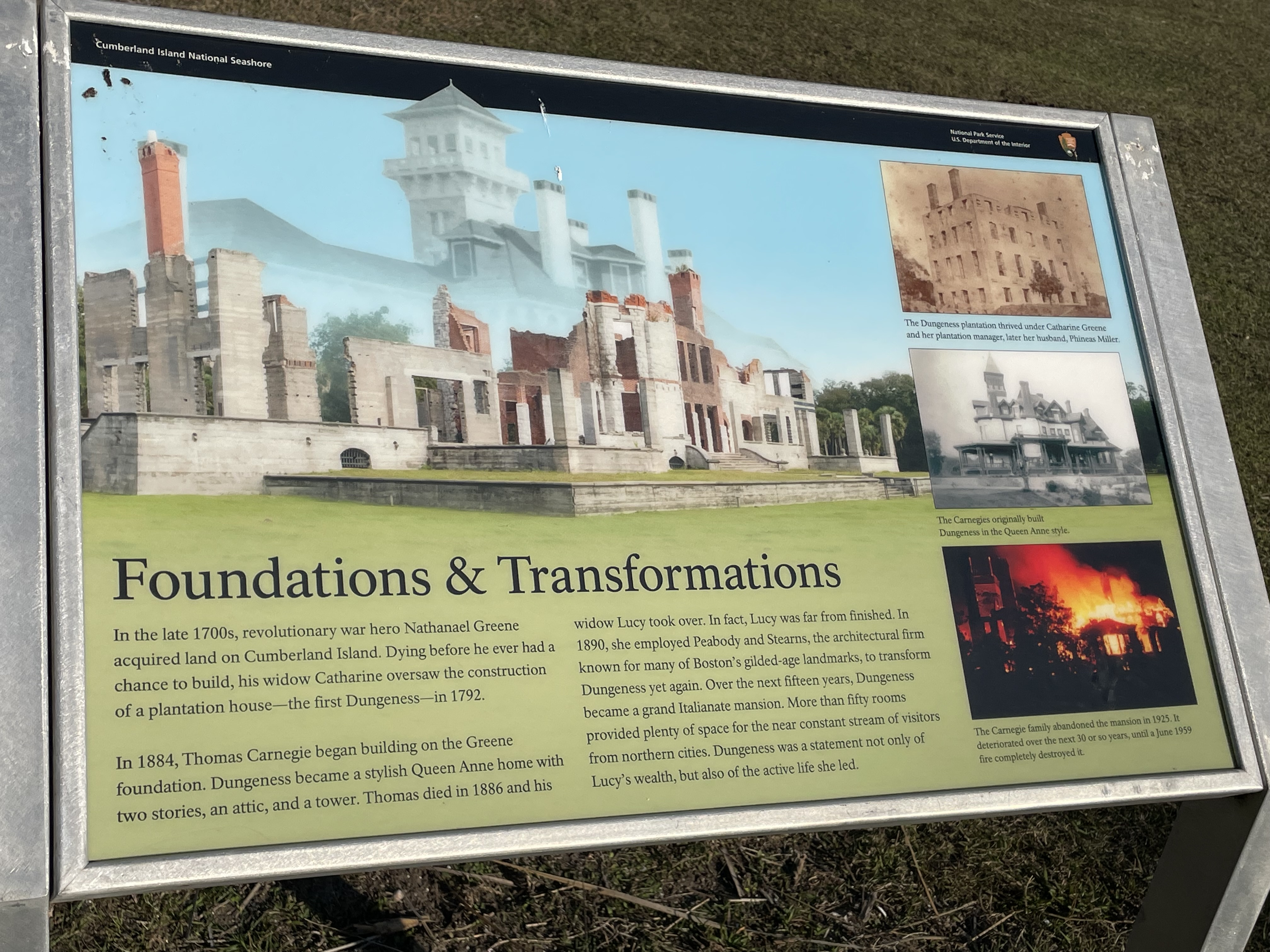 On our initial walk we ended up doing the 6.8km loop along the beach through the dunes and marsh boardwalk, which are breathtaking, to the Dungeness Ruins and back to the Sea Camp. There was so much to see that we didn’t even notice we had brought no water or snacks. (Water is available at the campground and the ruins). These were the ruins of the impressive Dungeness Mansion Thomas Carnegie built in 1884 as a Winter home for his wife Lucy and their 9 children. He passed away shortly after it was built but his wife made the residence self-sufficient and raised the children here, at times employing as many as 300 staff. There were green houses, vegetable gardens to feed everyone, a recreation complex with pool and Tennis courts and much more.