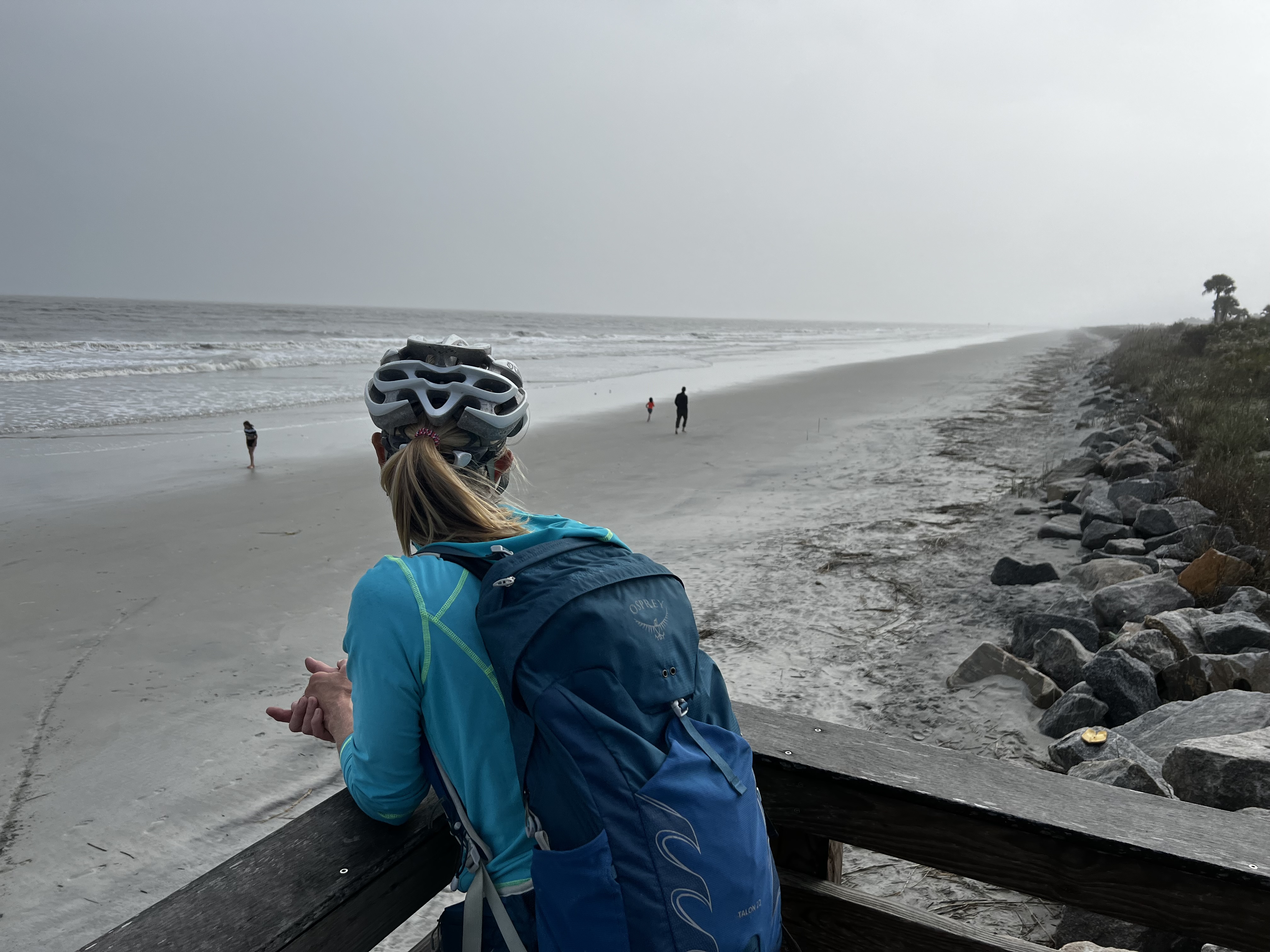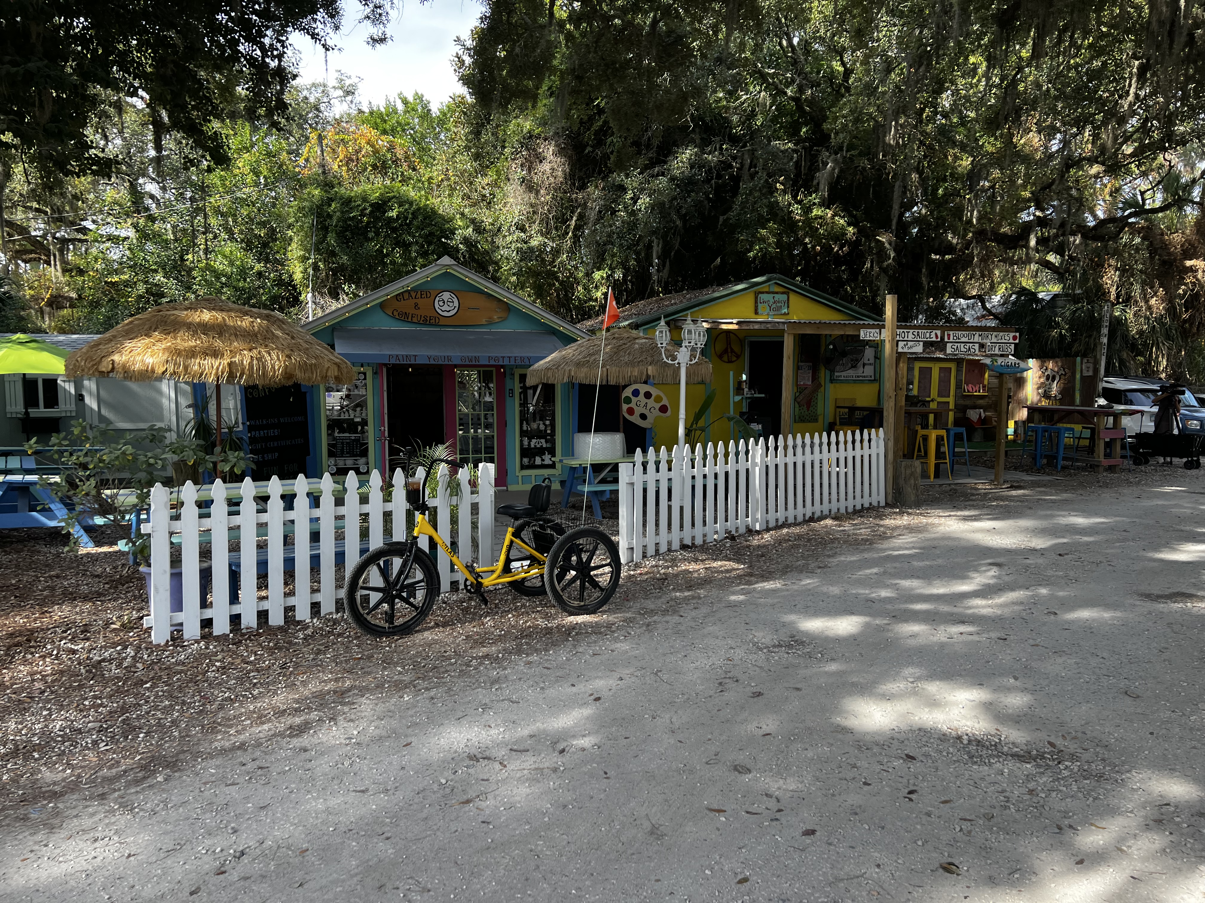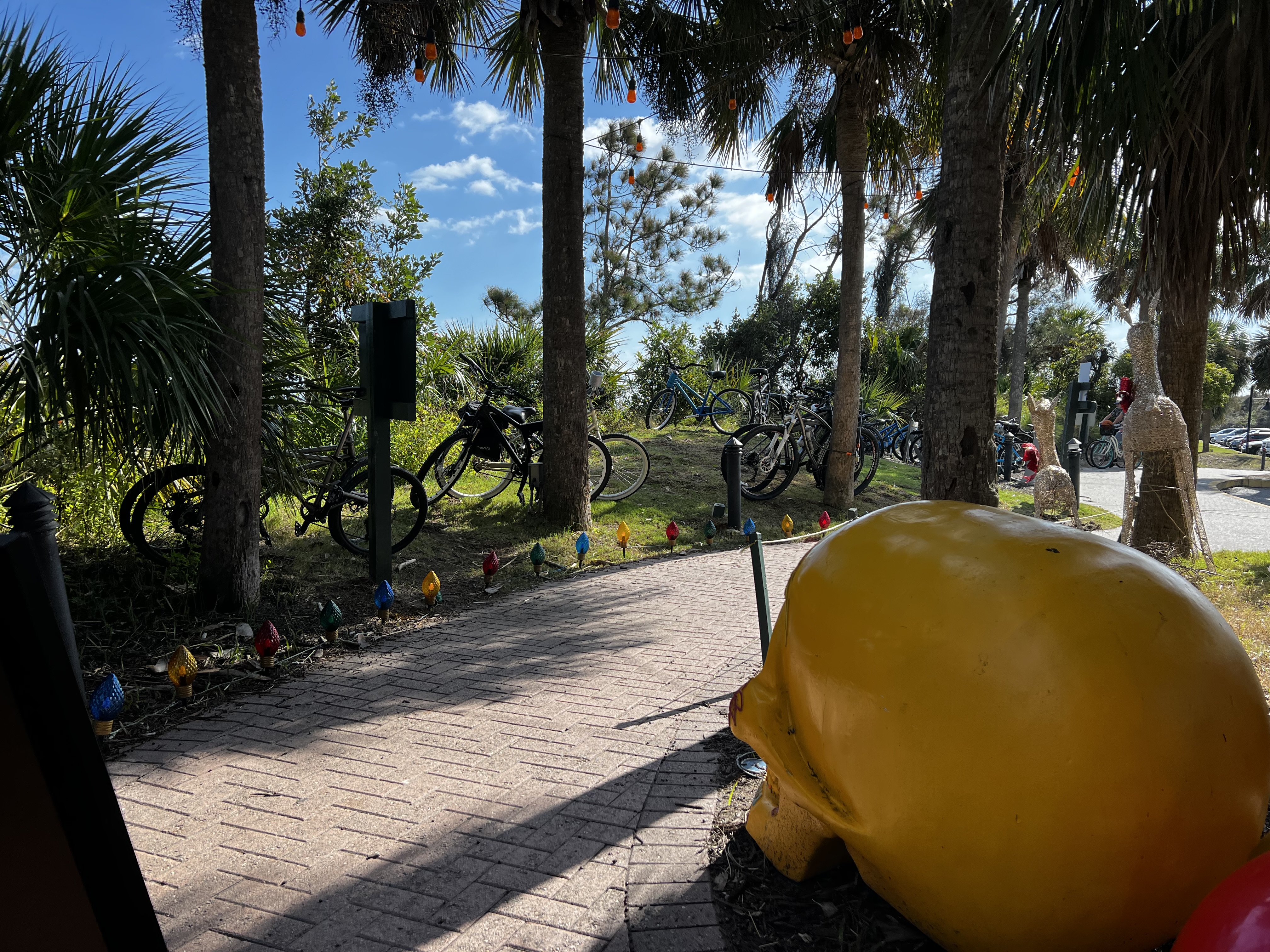 The second day we did some of the interior trails through the woods and were rewarded with seeing our first alligator. Definitely, a highlight – and not in a scary way. He or she was sunning itself in one of the slow moving rivers and looked rather sleepy. After a few hours of cycling around we got hungry and stopped at Tortuga Jacks on the beach. A live band, open air bar and view of the beach made the shrimp, steak and chicken Tacos we shared even more delicious.