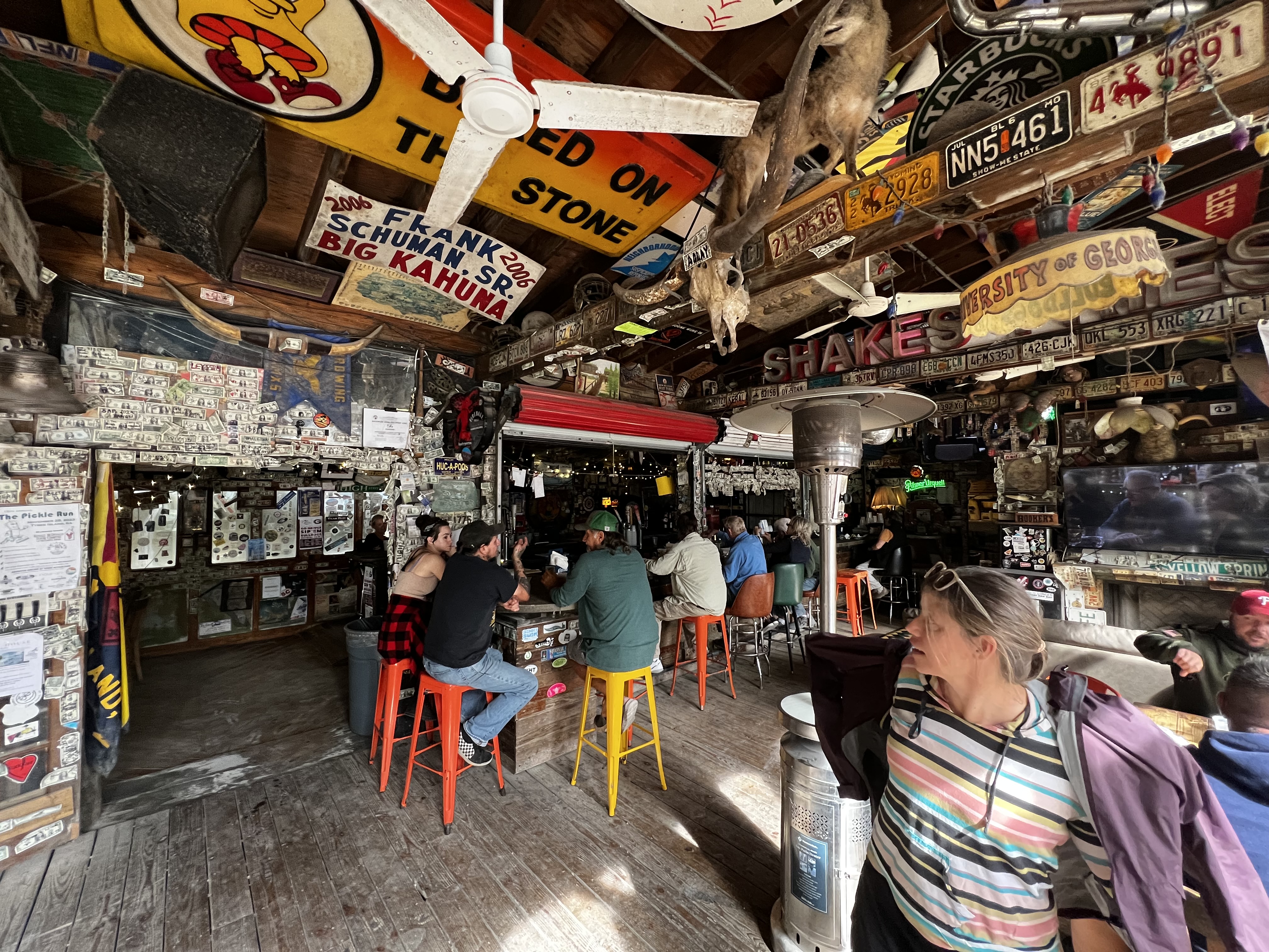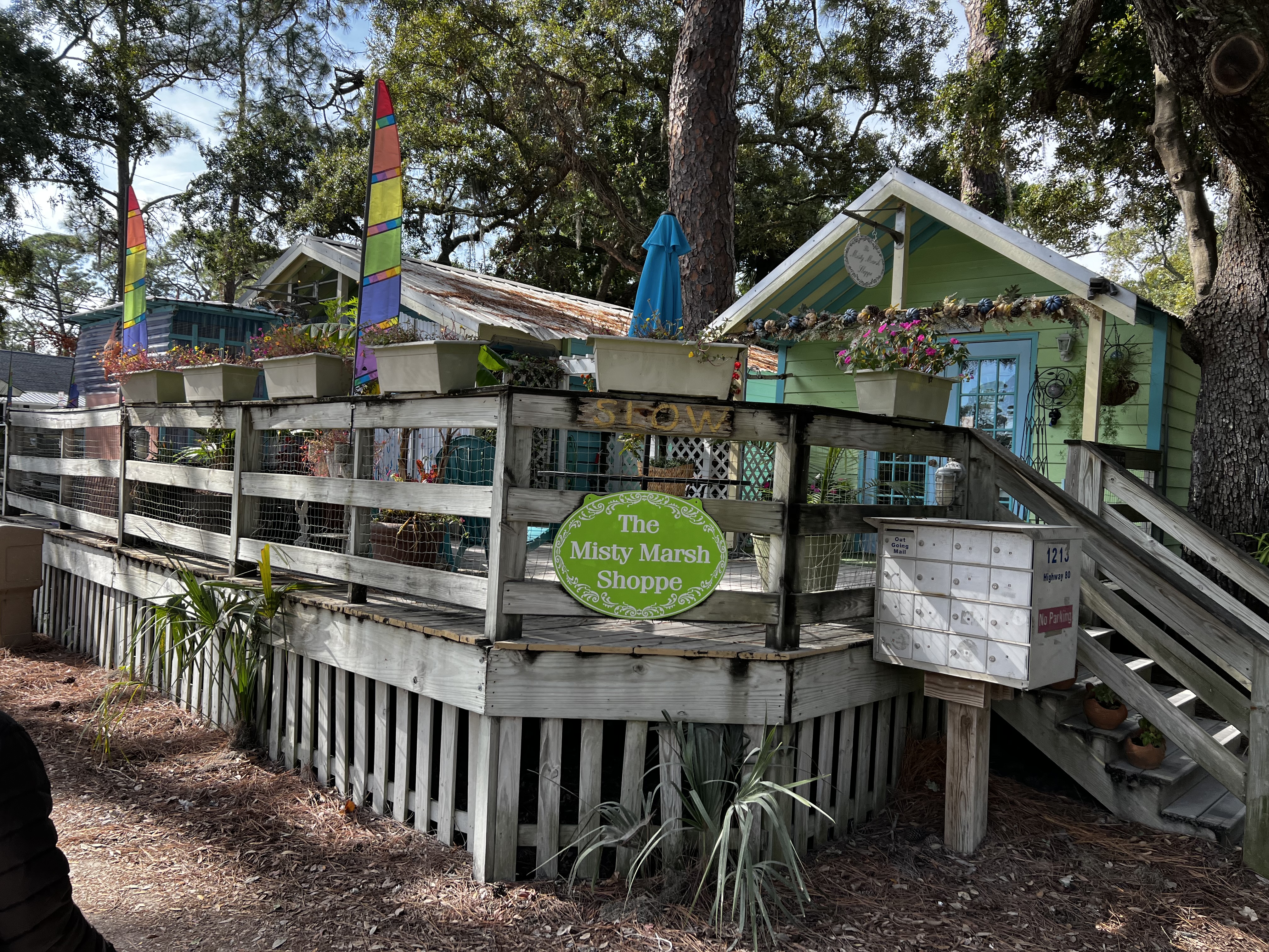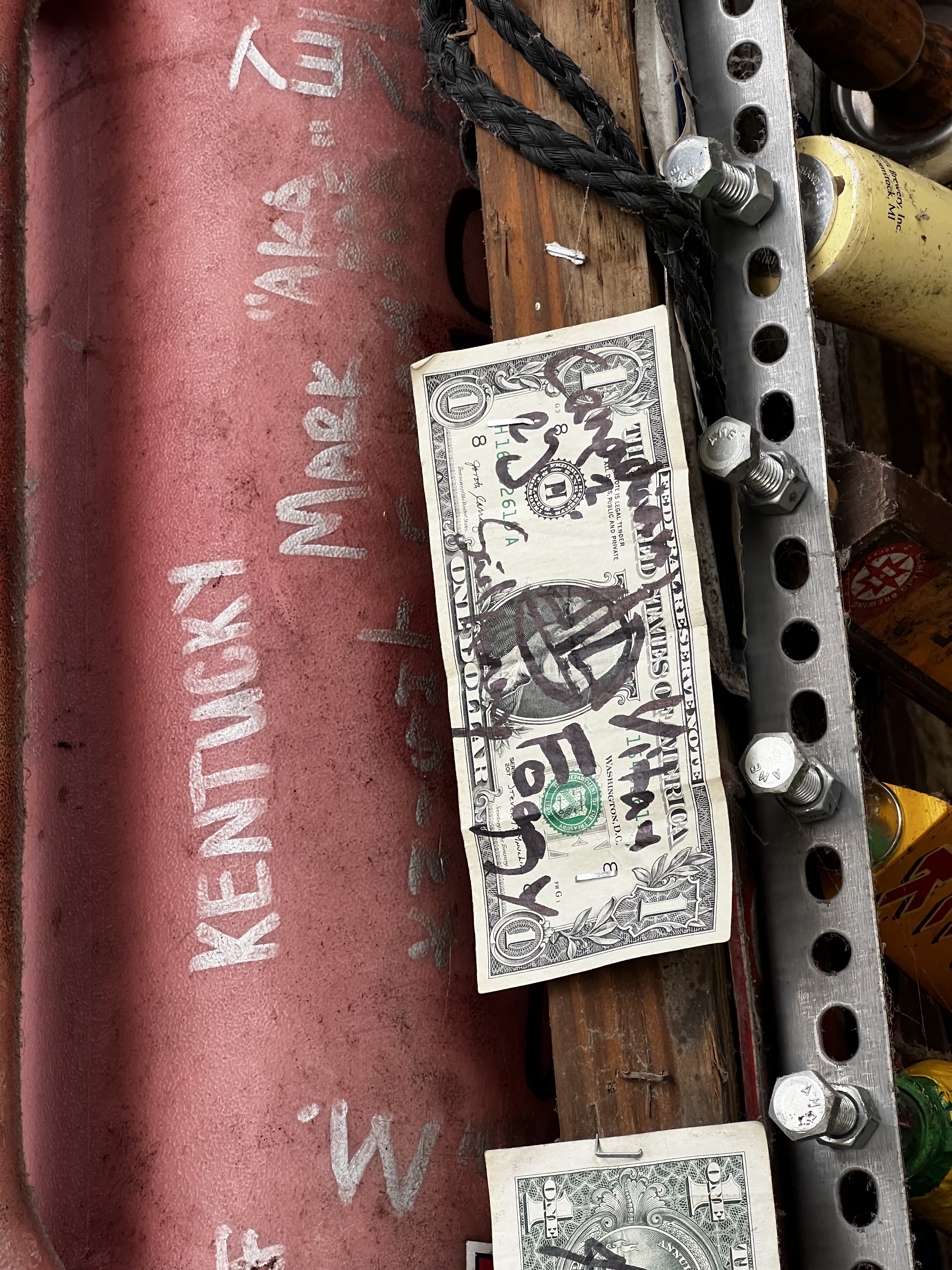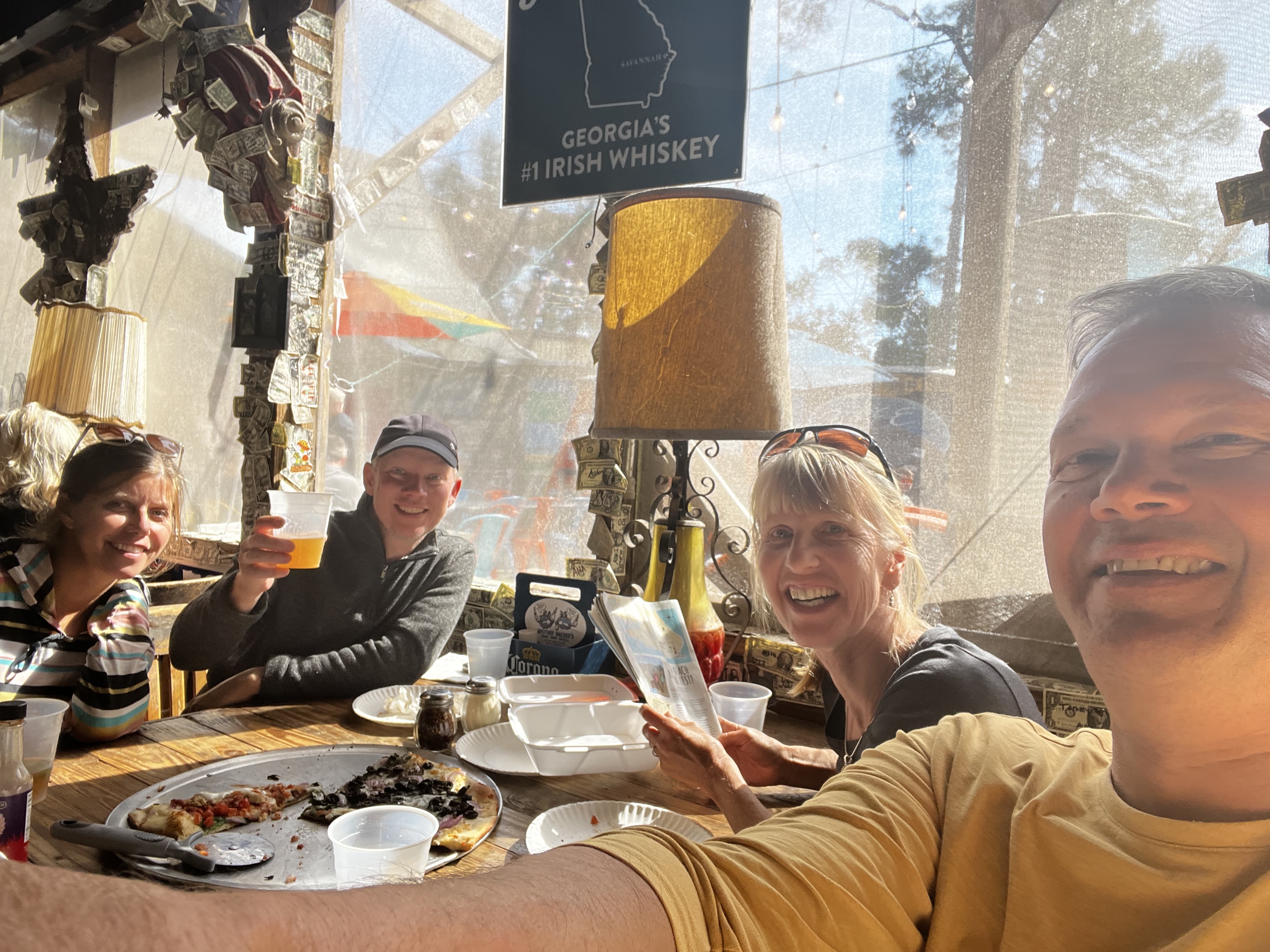 Shane and Lori had rented a car and invited us to explore our first Georgia barrier island – Tybee. It was a fun day spent walking the immense beaches, browsing some whimsical touristy beach shops and having a late lunch at a cool, no fuss pub called Huc-a-poos – which concluded with us signing our boat names onto a 1 Dollar bill and Dave standing on a bar stool to nail it to the ceiling.