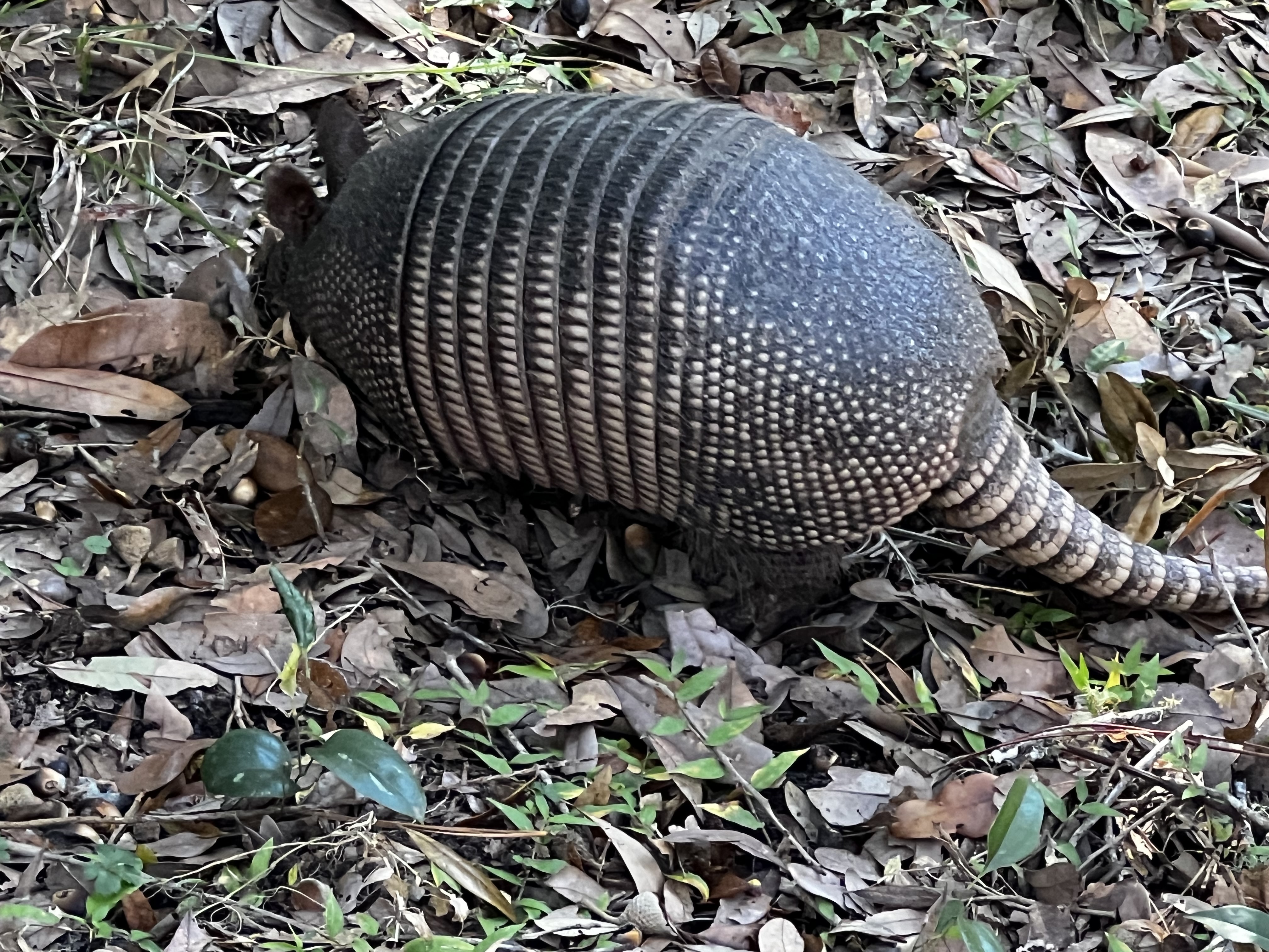 Another cute fellow we met, was the armadillo. We saw them all over the trails and road as we cycled to Plum Orchard the day after. They forage with their long noses on the forrest floor and seem pretty much unperturbed by humans, except the last one we saw. I think, he didn’t hear us coming and was startled. What does a startled armadillo normally do when threatened? Curl up in a ball! Nope, apparently the Nine-Banded Armadillo, that you find on Cumberland, can’t do that – instead it jumps three feet in the air! Now we were startled!