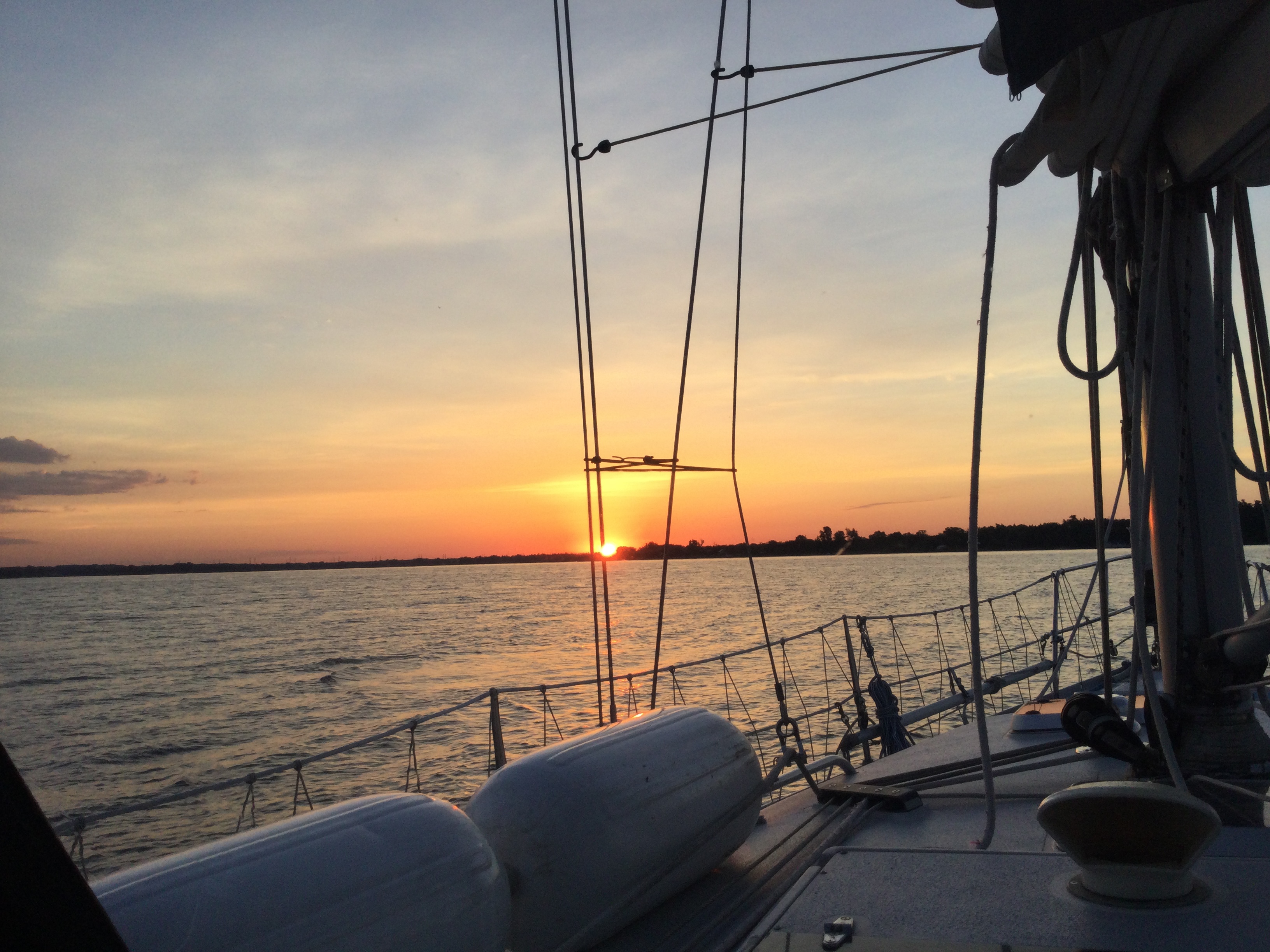 There was not much wind at first so we motor sailed with the Jib around Forester’s island and under the sky bridge by Deseronto. It’s always a bit worrying as your 65 foot mast goes under a bridge with 75 feet clearance. Of course water levels will change that hight and from the deck of the boat it always looks like you are going to catch the bridge with your mast. Then the next bridge was in Belleville, and we passed under it by 8:20 am.