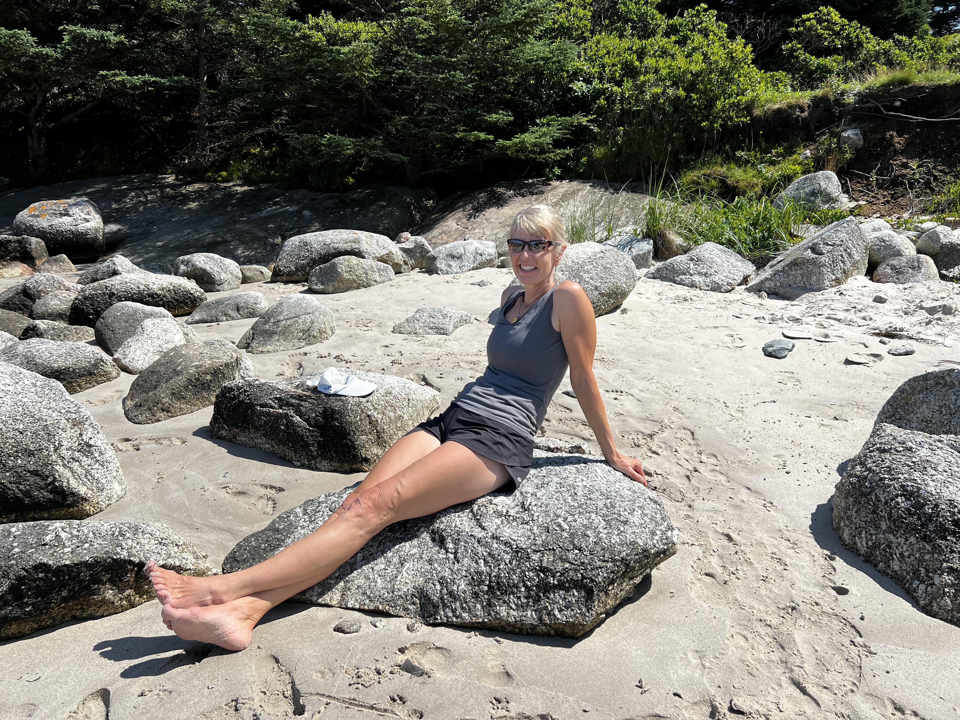 After a pleasant 8h sail we rounded Big Head Rock and headed into the area around Rogue’s Roost, which we were told by many cruisers, was one of their favourite anchorages. We felt it might be a bit of a tight squeeze to get through the entrance, and as the weather and conditions were beautiful, with winds from the west – the alternate anchorage just east of the sand beach on Hearn Island looked just too inviting. It’s a small, exposed anchorage with good holding in sand bottom. As it’s such a glorious beach at low tide, there was plenty of smaller boat traffic stopping and people were even swimming in the cold waters. Evan took the dinghy out in the morning and shortly after we received an excited call from him. He had stopped the engine and was floating in a pod of dolphins. He came back to pick us up and we were thrilled watching them swimming around and even under the dinghy. After checking, I am pretty certain they looked like white sided dolphins. They swam around the bay all day long. We got our kayaks out and later paddled through Rogues Roost and around to Club Basin and back to ‘our’ little beach.