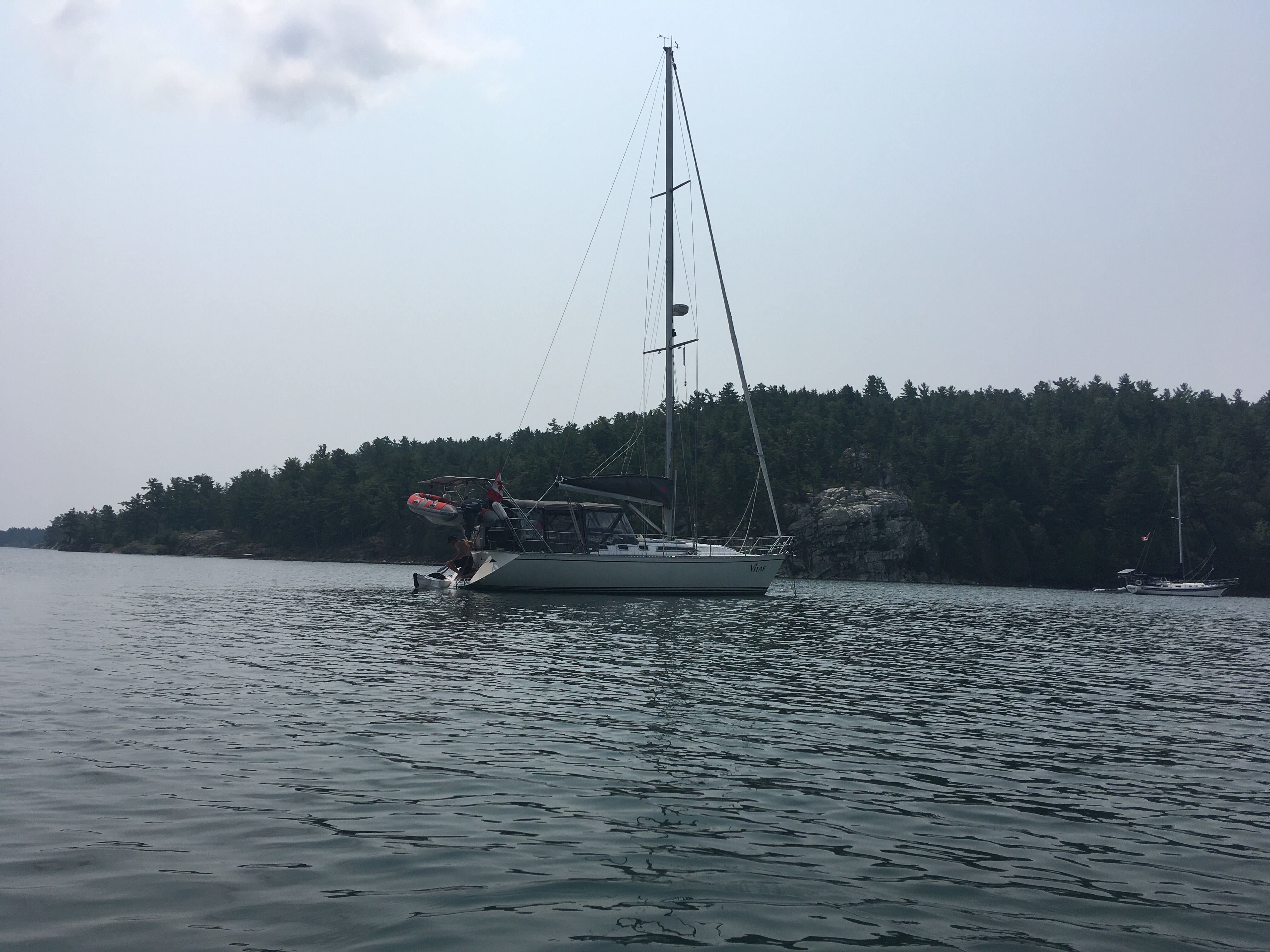 Since our friends Shane and Lori from “Foghorn Lullaby” were driving up to join us on “Vitae” for the long weekend, we took advantage of the favourable East wind. Under full sail we were making good speed planning to head either into James Bay or Club Island, but we enjoyed sailing so much we didn’t want to stop. So we passed by both these anchorages. We did see one sailboat tucked into Club Island, but winds were going to be from the South the next day, so why motor into it when you can sail longer the day before.
