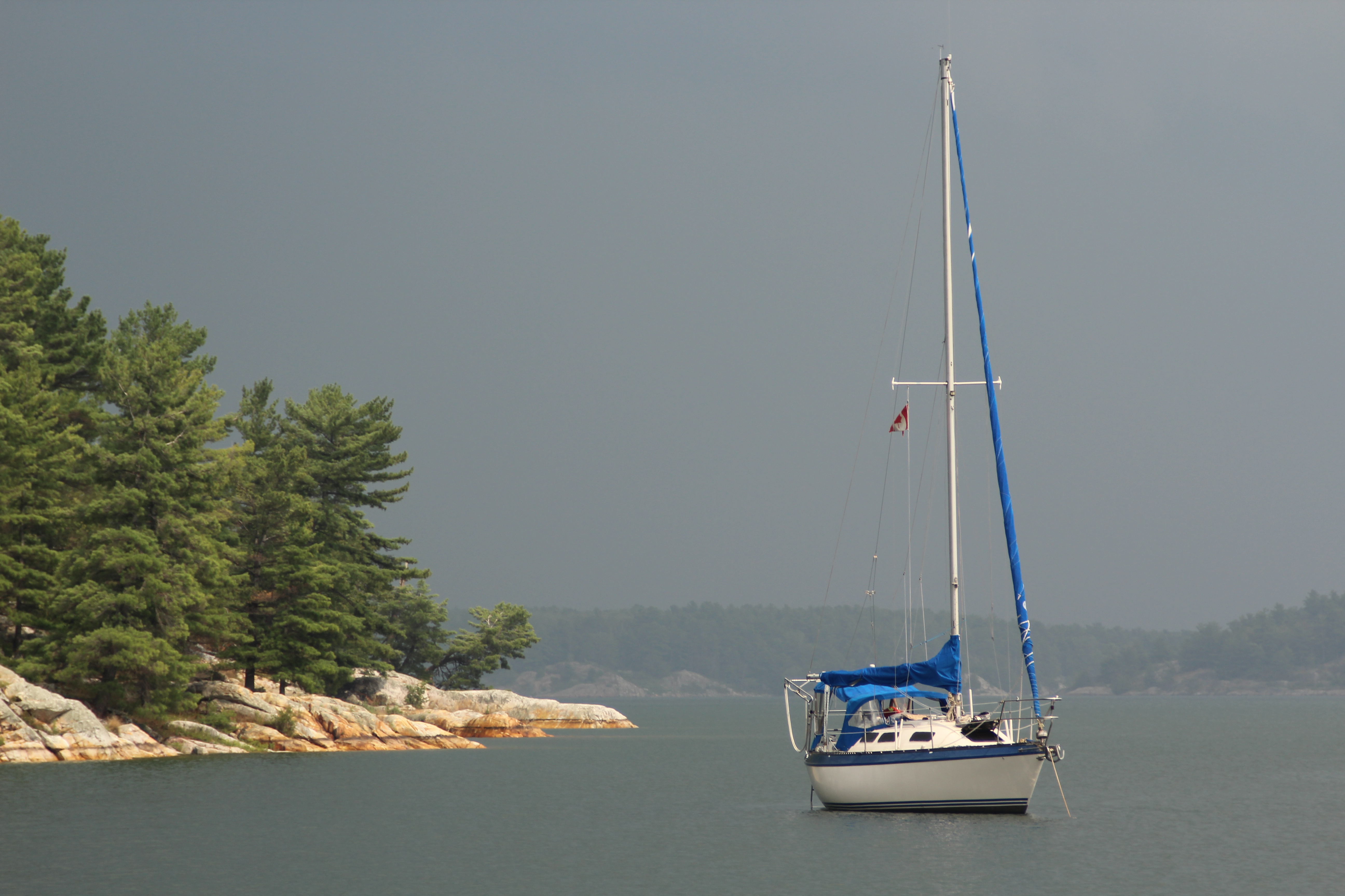 By 3:07 pm we were in the outer bay of Covered Portage. We tucked in close to the north shore but still with enough space to swing. The neighbouring boat had mentioned that boats swing a bit arbitrarily here, so we had reanchored a bit further away from them. As none of the other sailboats here were tied to shore we decided to follow their lead. Our neighbours were Ralph and Sue from “Ceiba I”, a 30 something Catalina out of Brights Grove near Sarnia. We invited them over for a sundowner and they were thrilled to get a tour of our boat as they had owned a CS previously. We had a fun chat sharing sailing stories and talking sailboats. Once again we realized – we need to make boat cards. It’s so easy to share your boat contact that way and you do remember names much easier from season to season. Another Winter project.