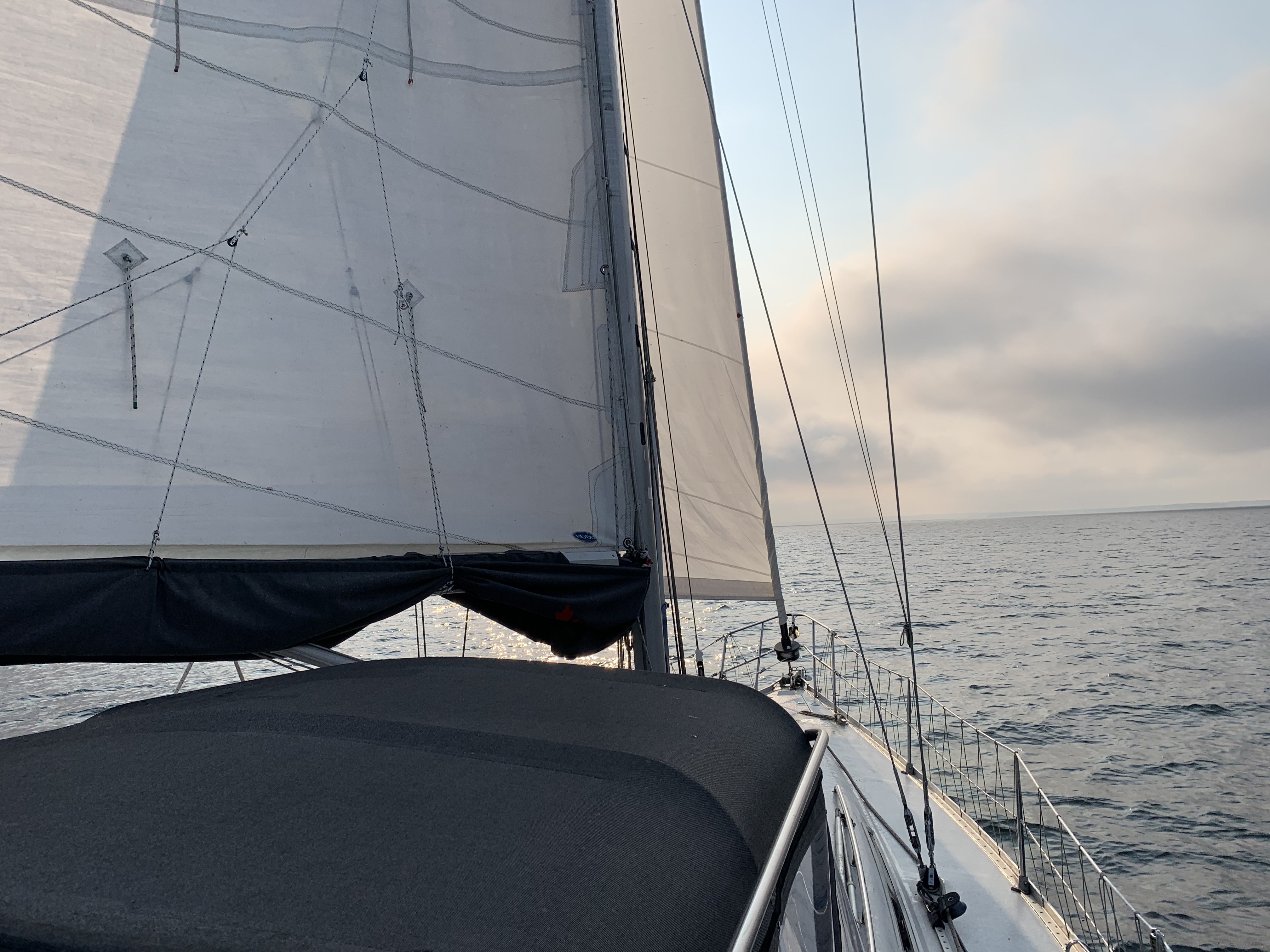 At 7:27am we untied our line from shore and pulled up the anchor. While motoring past Amedroz Island we hoisted both sails and saw Gaviidae and Komeekha still in the anchorages there. They had sheltered from the wind and rain on the East side in a larger anchorages with a few other boats. As we later found out on the cruiser’s net facebook page, they had been treated to a sunset concerts by a couple of pipers on “Moondog” and another boat. Guess we missed out on that.