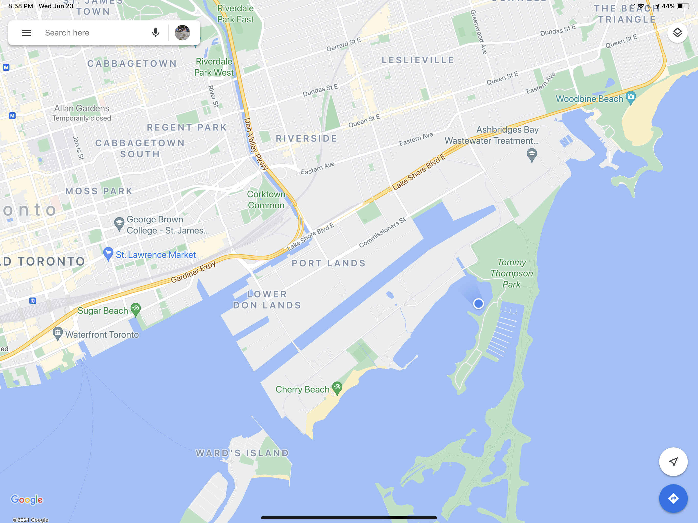 The wind picked up a little to ssw 8-10kn and we sailed close-hauled at 6 kn right into the Outer Harbour of Toronto. We hooked east around the Leslie Spit, past the Multi Hull Club and into the end of the Bay. Navionics mentions it as “Downtown Anchorage” right by Tommy Thompson Park. Even in strong winds coming from s or sw, you are sheltered in here. The bay isn’t huge but it’s deep right to shore on the south end, where you find the most shelter from sw winds. The hold is good if you wait for the anchor to settle before you set it. Pay out lots of rode as depth is 20’ or more. Because the spit was man made, there’s some rubble on the bottom, but with a bit of patience your anchor will find mud and dig down into the clay below. We spent 2 nights here and really enjoyed our time.