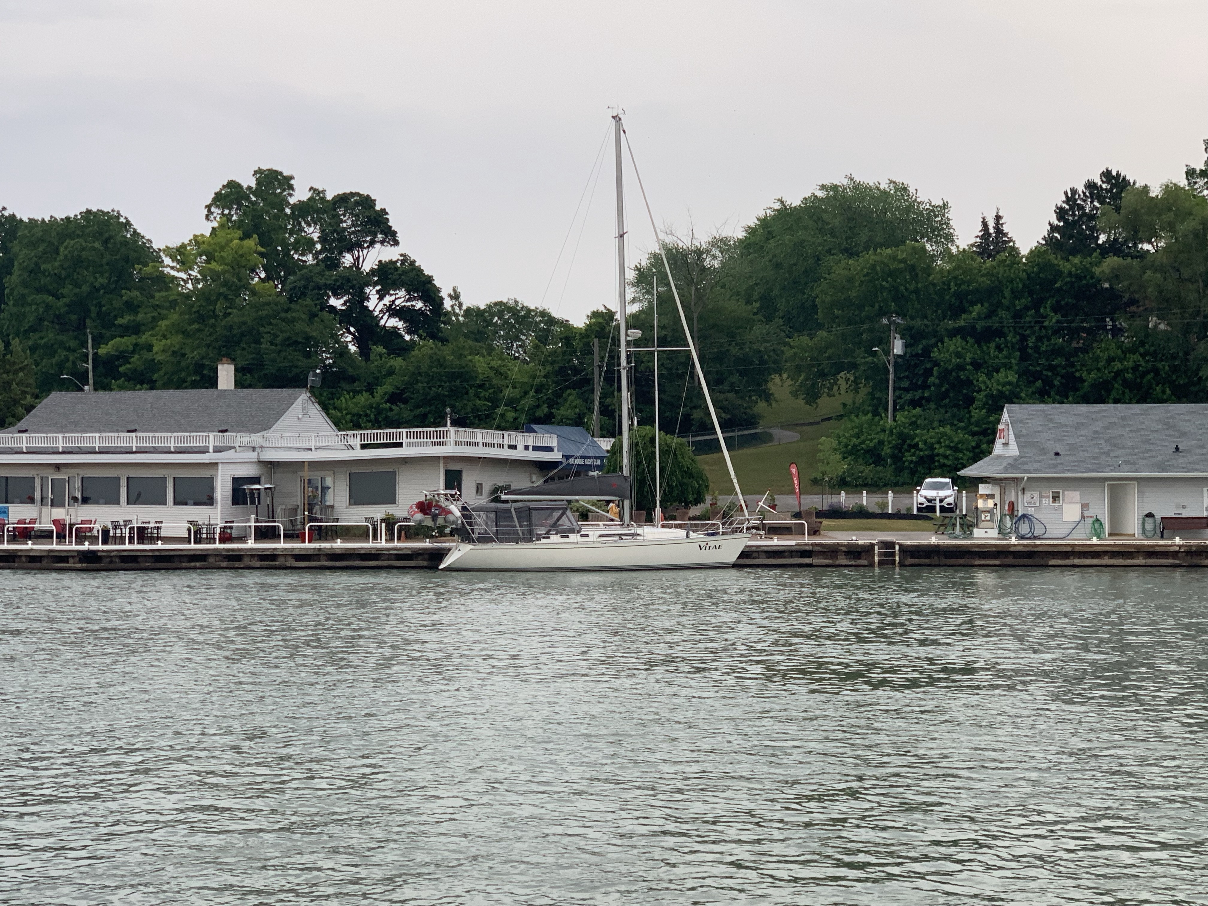 We dinghied over to the Multi Hull Club and visited with friends Shane and Andrea, whose catamaran “Carpe Diem” was docked here. The club also offers 2 nights reciprocal but it might be on a mooring ball. There’s no water on the docks here, but they have a nice club house with fire pit and showers. Its a very friendly, down to earth club and they welcome all types of boaters. Andrea and Shane love cruising the Great Lakes and also plan to take “Carpe Diem” south, hopefully next year. Just recently they have started their own distribution company for sailing equipment. Check out Indie Marine for some well tested marine products.