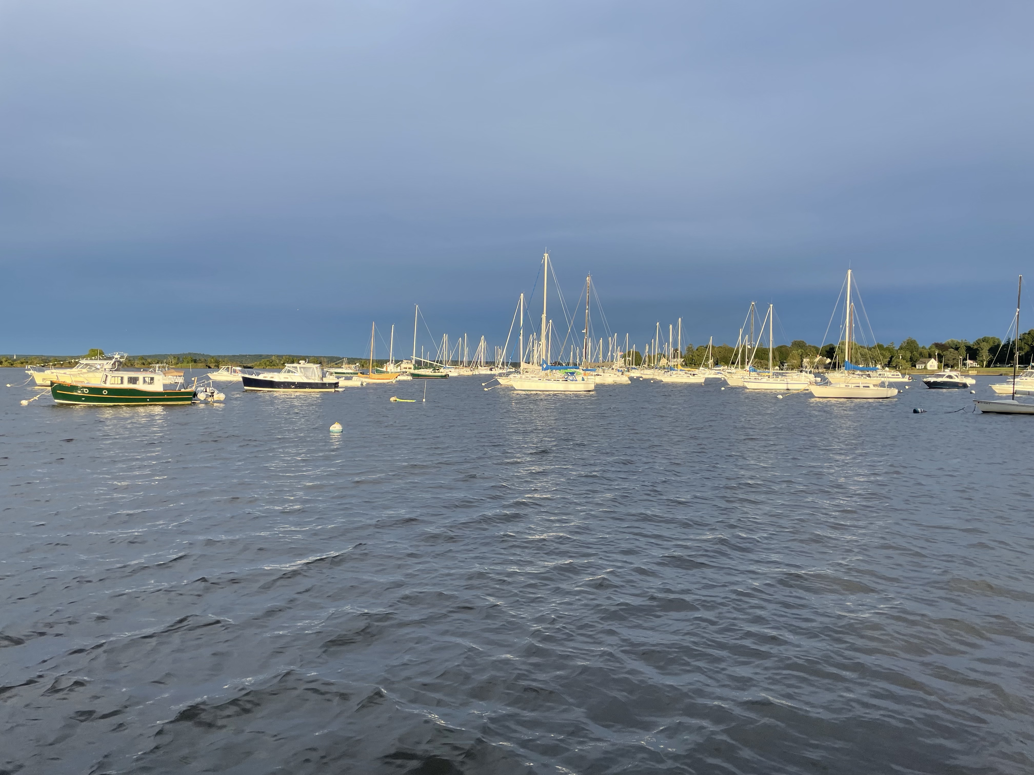 Approaching the entry to Old Saybrook, the sky turned darker and darker. We had the sail furled in and then a squall hit just as we entered the mouth of the river. It was hard to make out the narrow entry past the break wall. AIS showed that another boat was about the exit so we slowed up to let them come out before we entered. Once inside the break wall the waves calmed substantially and the squall died down. We saw some very ritzy big power yachts going by the Saybrook Point Marina and then we turned to port and into North Cove. Navionics showed that the cove was really too shallow for us except the dredged out mooring basin in the middle. There were 4 or 5 rows of at least 10 boats moored. We slowly went through the middle of it looking for a free ball with a yellow ribbon as those were supposedly open and free. We couldn’t find one but were able to grab an empty mooring on the south side amongst some smaller boats. At least this was a temporary stop until we could figure out the lay of the land. We hopped in the dinghy and explored the west shore, stopping at the North Cove Yacht club (where we saw no-one) and then the town dock. Here we learned from a sign at the town dock that the 3 closest mooring balls belonged to the city and were free for 3 days. That’s what we were looking for, but how shallow was the water here, and there was still a 3′-4′ tide.