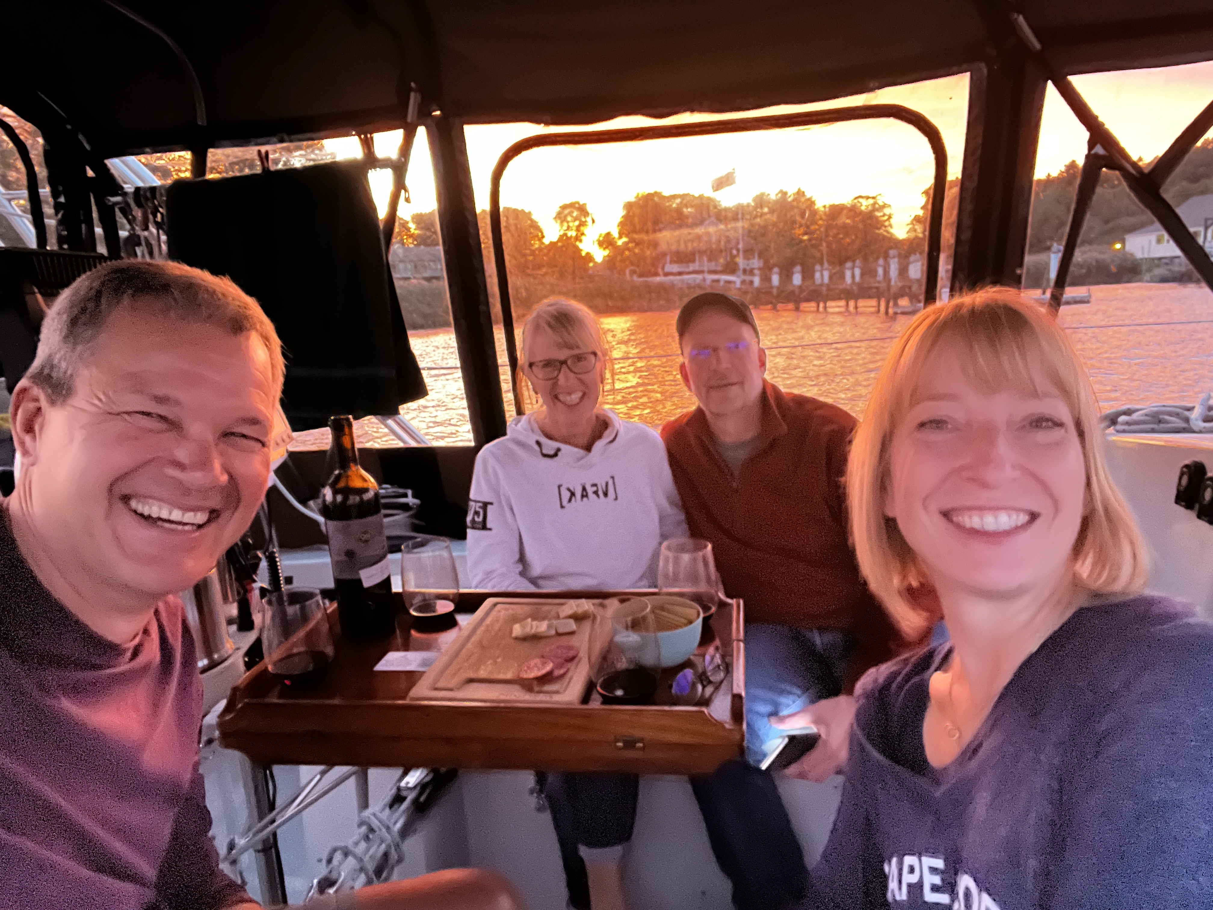 It was great having our friends Paul and Karen join us on the boat for dinner the first night and then being able to go for a hike at the Devil’s Hopyard State Park, which was a little further inland. Their son Ben, all grown-up now joined us as well. We hadn’t been in a car in a while, so even the drive there was a highlight. We ended up at their house in Colchester after and at a little local pizza dig for dinner. Of course we enjoyed way too much great Connecticut pizza. What a fun visit, but way too short!