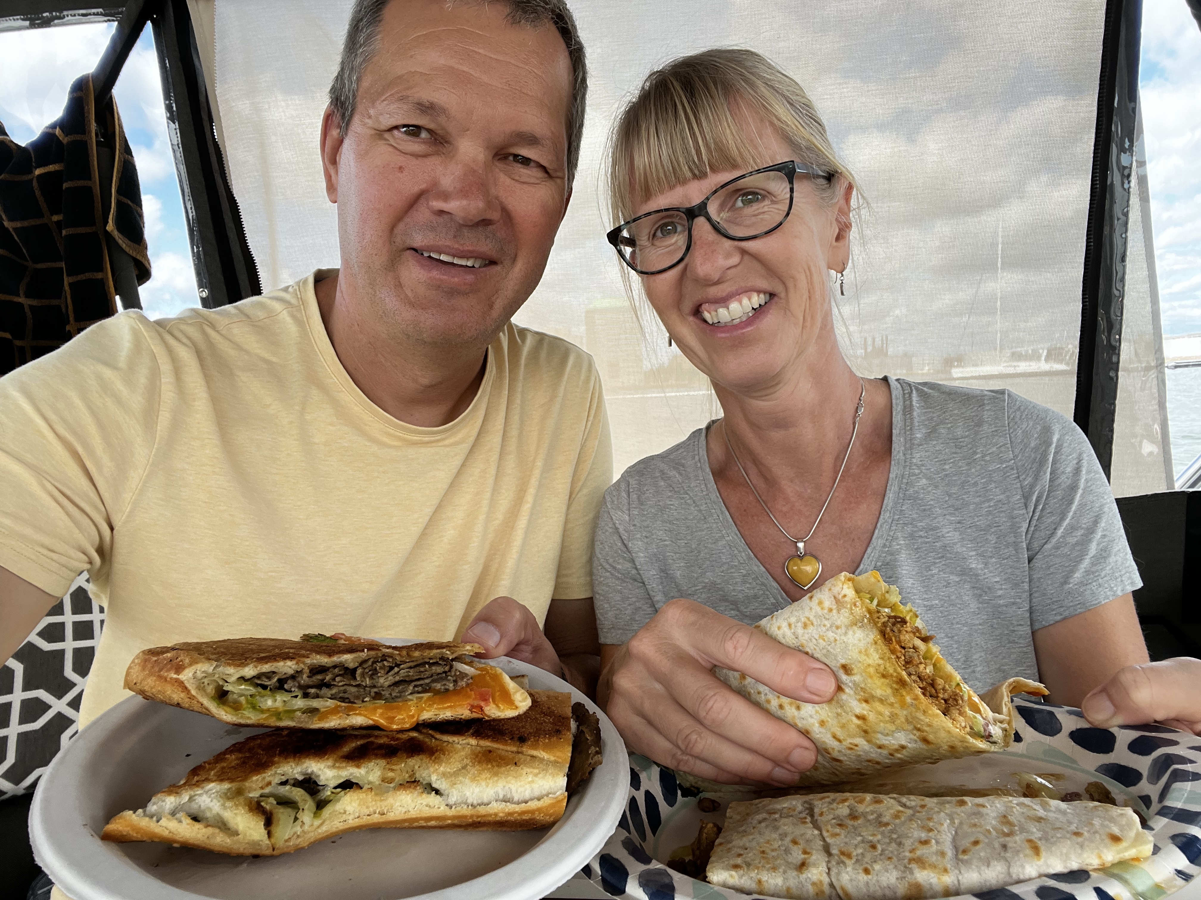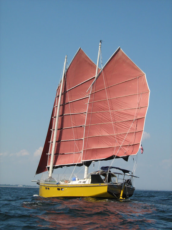 On our way back to our boat we stopped at one of the town moorings to talk to the crew of Terrapin, Mike, Debbie and their son Nicolas, plus their 2 cats. They built Terrapin themselves, and it’s a Chinese Junk style rigging. Here’s a boat tour of Terrapin. It took them 9 years to fully build it.