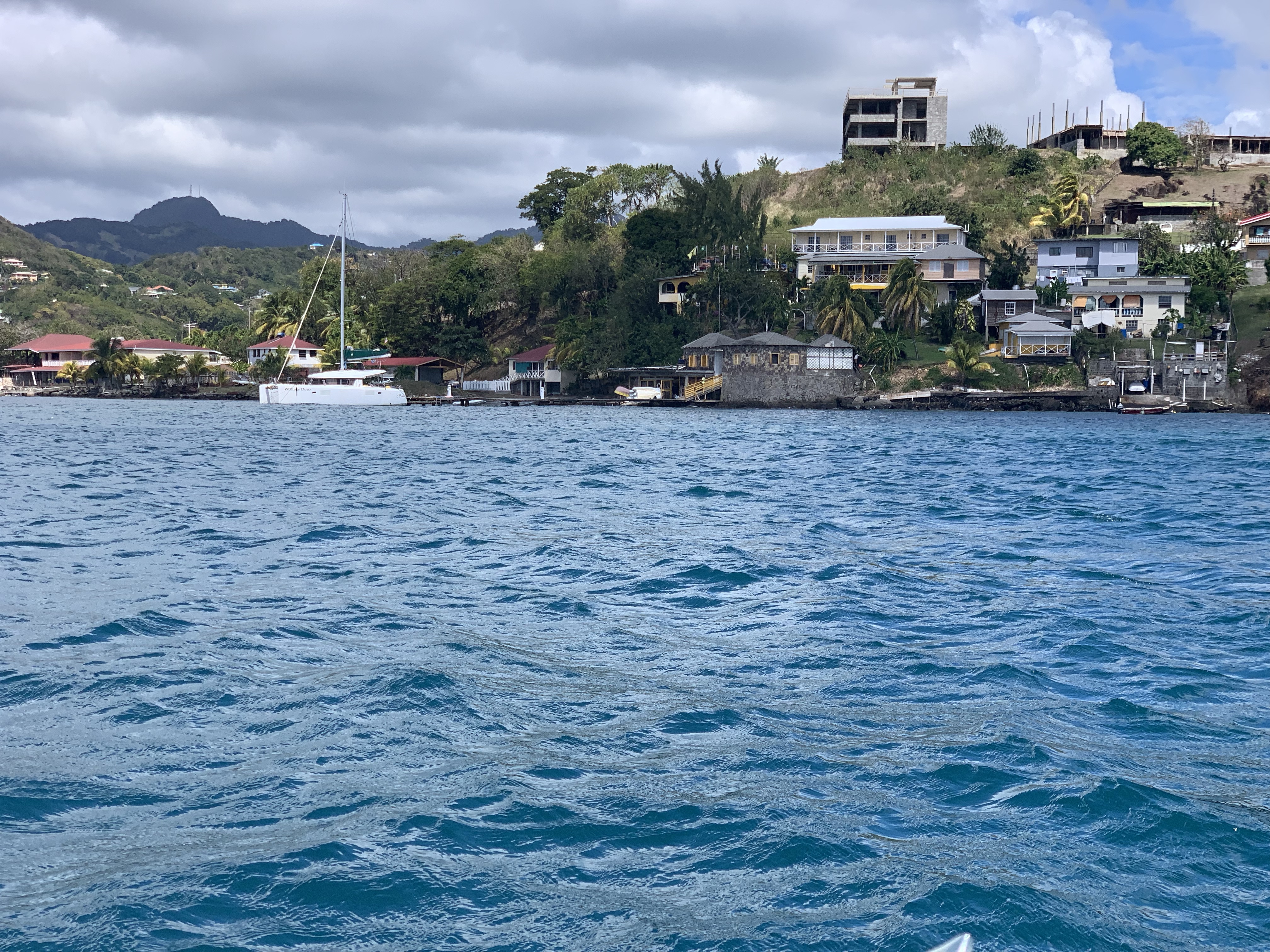 It was a quick sail over to Bequai, which is just about 10 NM south. We got our first introduction to sailing a catamaran. Since this cat was set up for cruising charters it was almost too easy to sail. Willow Dew (what a great omen – our granddaughter’s name is Willow!) was built in 2014. Equipped with 2 engines, a generator, solar, freezer, fridge, electric winch at the helm for raising the main, electric windlass and a self-tacking jib, this boat had all the comforts. Not a high performance sailer, but safe and quite easy to sail.