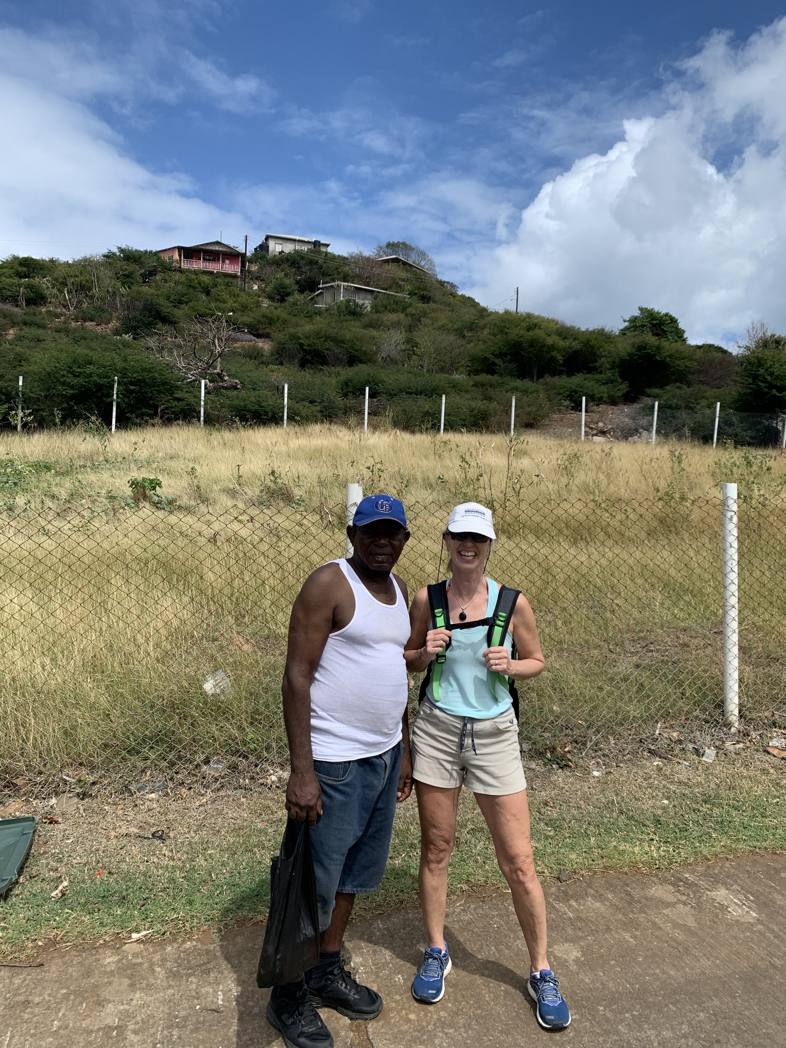 This is were we met Barry, one of the locals who was sheltering under a porch in the downpour. I had asked him about directions making sure we were on the right track. Turns out he was walking the same way down towards Clifton, the largest town on Union. We had a great chat and found out he had 2 daughters, one in the States and one in Canada. He showed us what the native Manchineel tree actually looks like. It’s known to be poisonous – the fruit, the leaves as well as the bark – and when it rains the poison washes down. So not a good spot to shelter from the rain. Another interesting local plant was the Love Vine, an orange coloured vine that literally hugs the top of trees. According to Barry, this vine also makes a good tea to cure prostate ailments. Eventually we came by Barry’s house overlooking the bay in Clifton and said Good Bye.