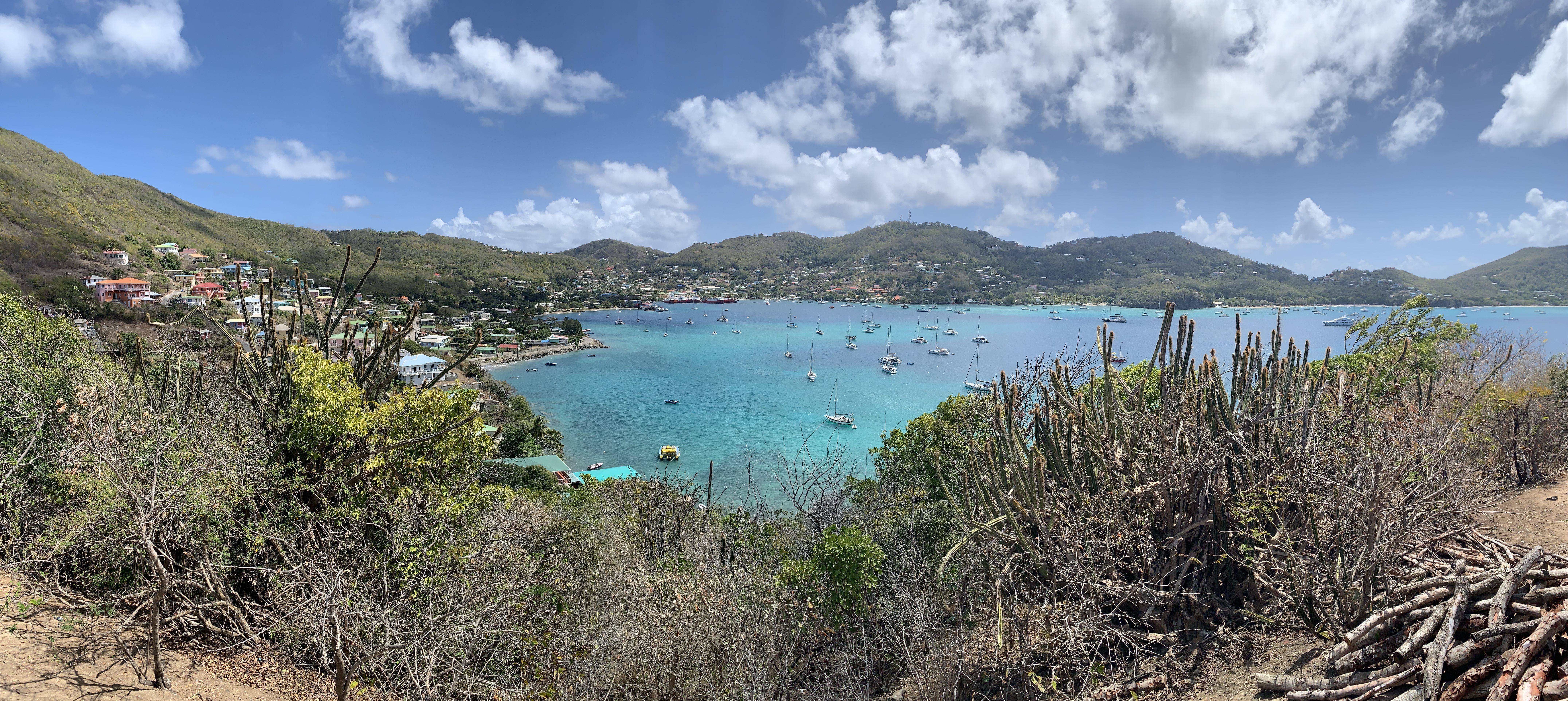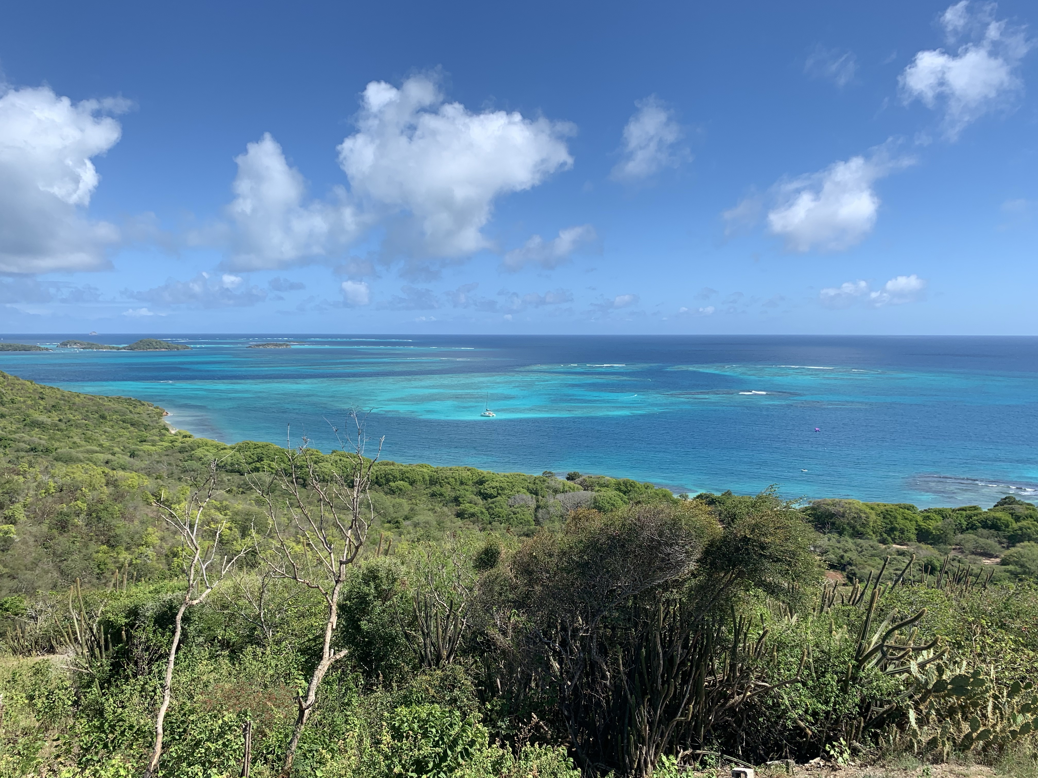 One of the highlights was a hike around Union Island, at the southern edge of the SVG archipelago. On a clear day you can see the outline of Grenada from here. A rough ATV road leads up from the beach and connects to the proper island road. With running shoes it was no issue walking up the steep hill and once at the main road the walking was rather civilized, more a walk than a hike. The day was a bit overcast and at the top of the island we got hit with a nice rain shower to cool us off. The views were spectacular with the odd rain cloud chasing across the horizon.