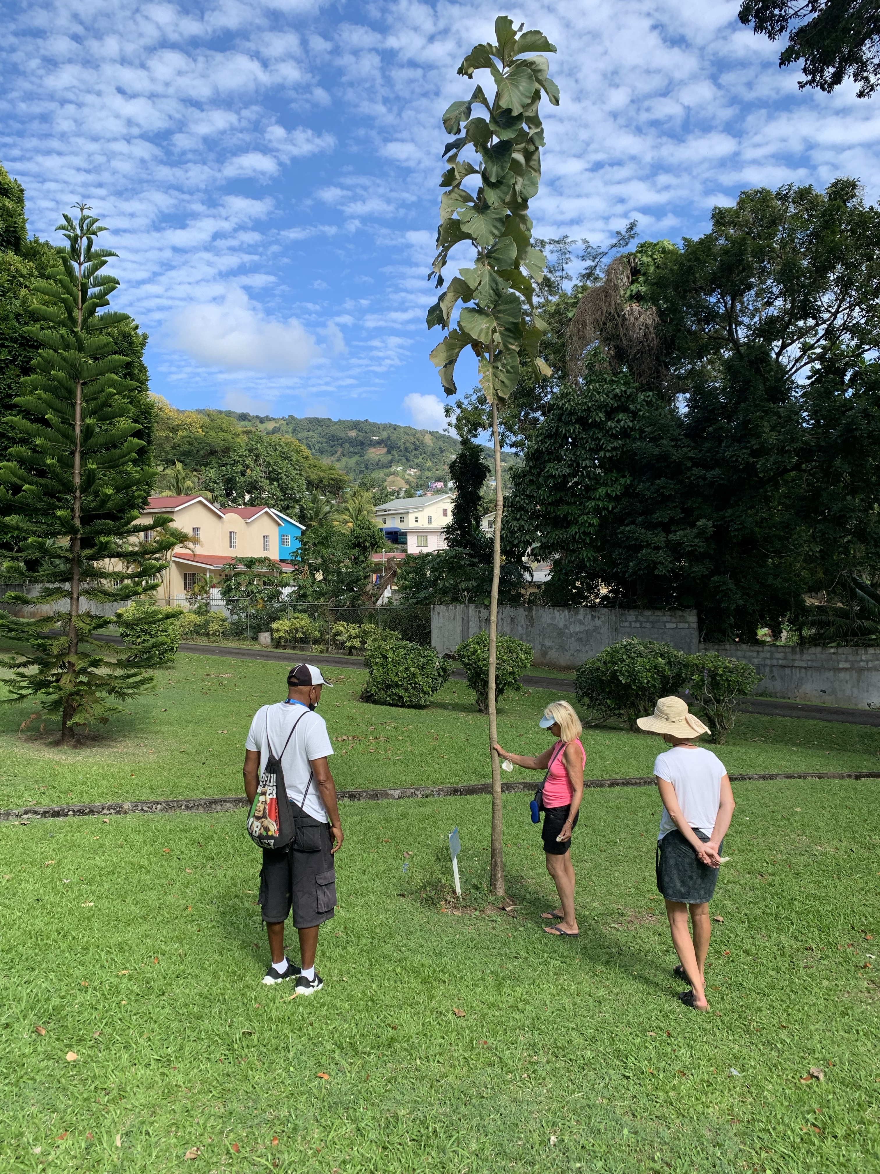 On our trip through Kingstown we walked along the street market area down by the harbour. The number of vendors is astounding. Not only are there many little stores that sell various grocery or clothing items, in front of every store there are tables with people selling everything from small bags of spices, candies, fruits or veggies to underwear, shoes or jewelry, some even out of the back of their cars. It seems everyone in SVG has something to sell. It was refreshing to walk up towards the Botanical Gardens and take a guided tour there. The garden is quite impressive with many tropical shrubs and trees from all over the word. Several trees or shrubs that we know as house plants up in Canada, were absolutely huge in this outdoor environment. We had a very overzealous tour guide, who was quite knowledgeable although hard to understand sometimes. He loved to tell us about the many medicinal purposes of various plants. There was always a tea that could be brewed out of it and it would cure cancer! This wasn’t the only time we saw how important the healing power of plants is in this part of the world. After 2 hours we were exhausted but also felt like we had gained a lot of insights into local culture and our bags were stuffed with bits of cinnamon bark, nutmeg and other goodies. It was well worth the visit!