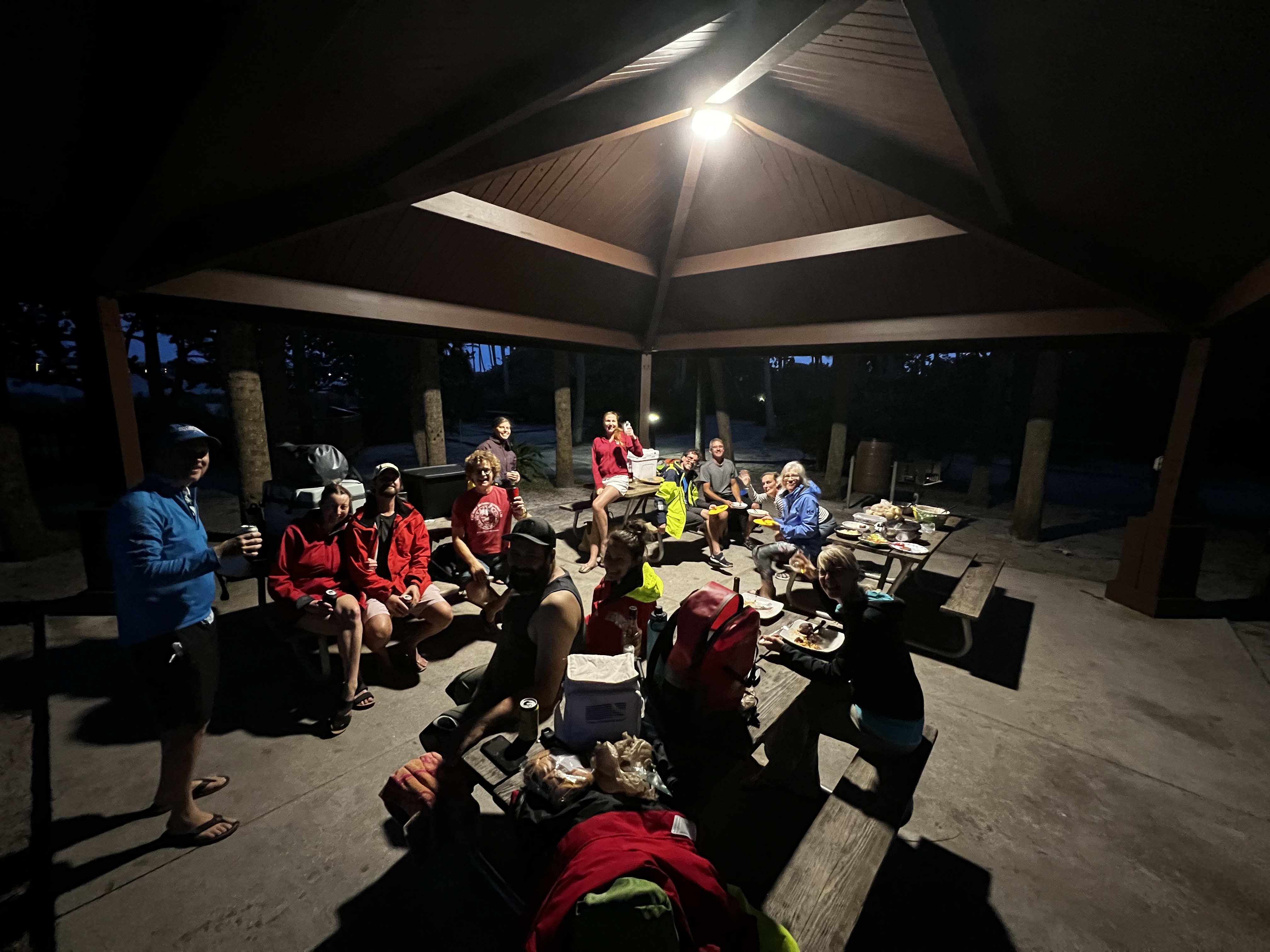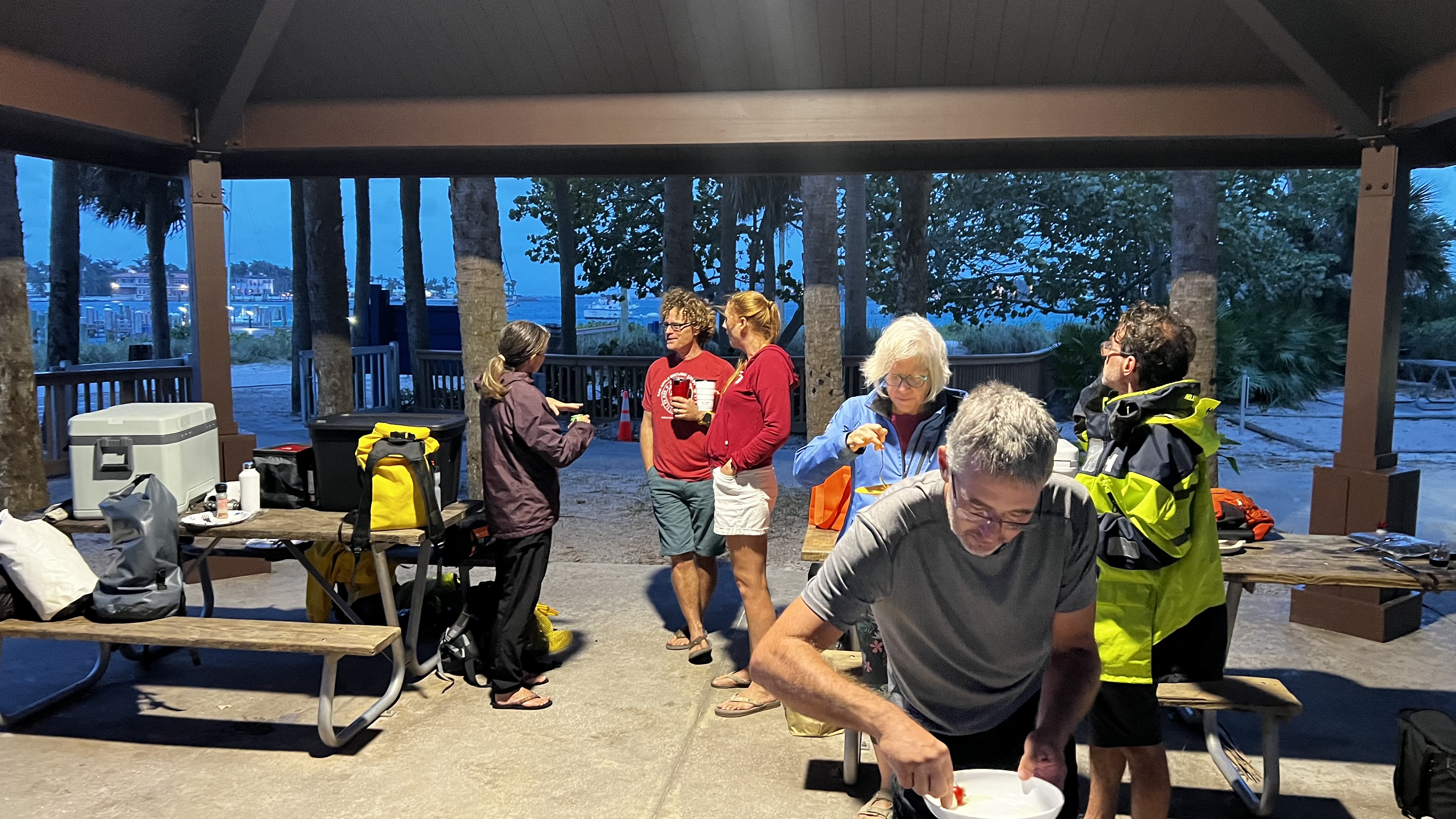Well, most of us moved our boats closer north toward Peanut again – by now we had to stop at the Riviera Beach Marina again anyways for another pump out and water to be ready for the crossing. It was looking like it might be possible right after Christmas! Then we dinghied over in the early afternoon to Peanut and had the island all to ourselves. It was cool and rainy – and really only Canadians would think to do an outside Party on a day like this. – but even our American friends were troupers. We had a large roofed picnic shelter with lights and charcoal bbqs and tables for our group. Everyone brought delicious food to share, lots of drinks and Jon had the foresight to bring his bluetooth speaker. Some of us even went for a quick cold dip and we had a blast – cruisers style Christmas! And really all we wanted from Santa was warmer weather, blue clear waters and a window to cross into The Bahamas! We were so ready!