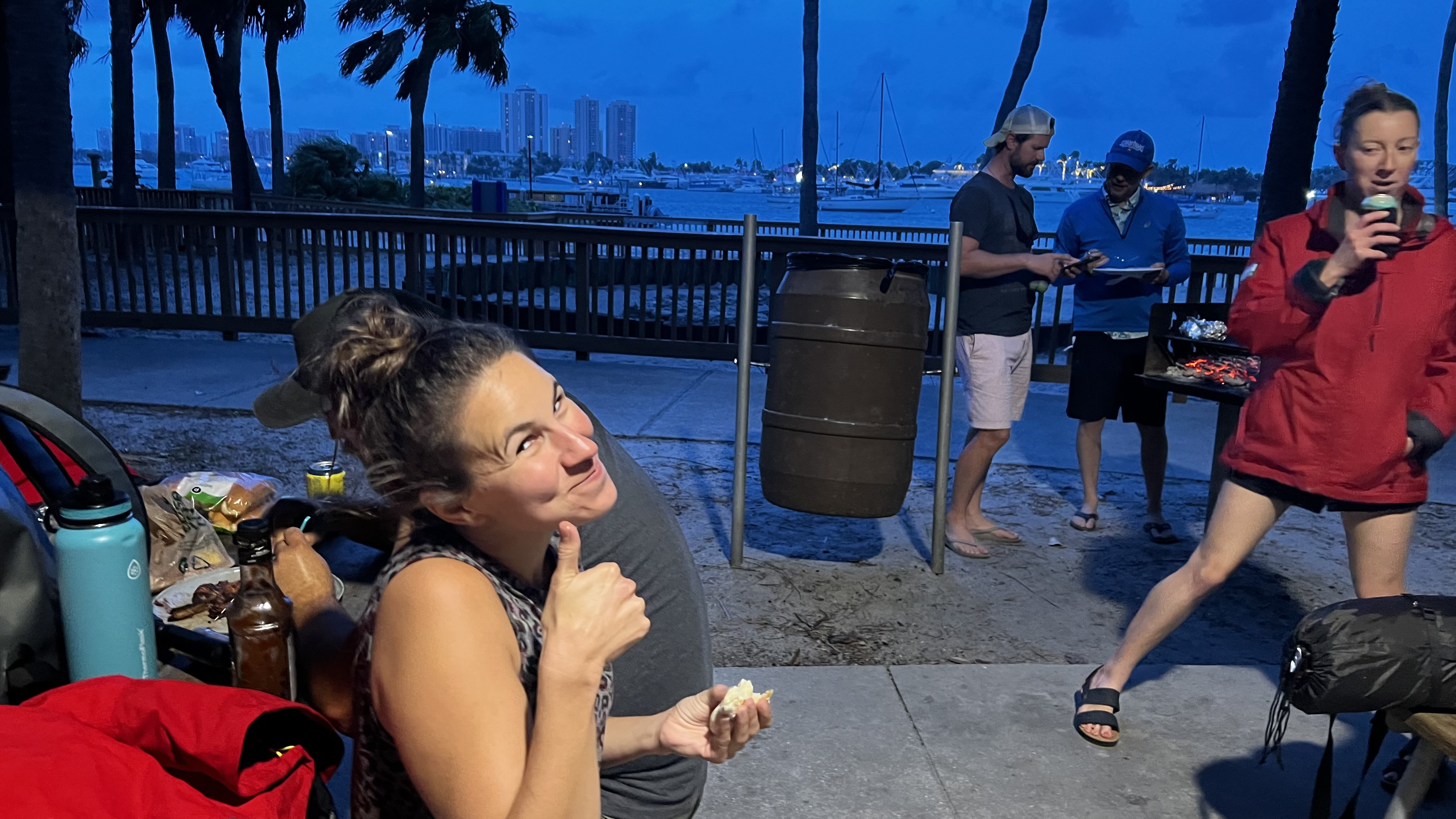 A large storm front was coming and we moved Vitae further south down Lake Worth, just north of the Flagler bridge where we would have lots of room to swing. Here, we were just with a few boats, like Foggy, Willow and African Queen with lots of scope out. It was a little less convenient to get to the dinghy dock at the Sailing Club and still a ways to the free city docks south of the bridge, but turned out to be the best choice for the Nor’Easter that came through. It raged for 3 days, blowing 30+kts sustained and one night we saw 58kt gusts. We had a group text going and heard boats were dragging everywhere. Summer and Brian on Mojo, another boat in our group was anchored just south of Flagler Bridge. A great spot to be in so close to the public docks and easy access to town. They were somewhat more protected between the bridges but also had way less swing room. The next day we saw Summer’s short video as a sailboat nearly missed them and then got tangled in another boats anchor. Further north of us boats that had no one on them at the time, broke lose or dragged through the tight anchorage. There had been already a few boats on the shore or sunk in the area before the storm but now there were even more. A sweet little ketch was now sitting on the rocks at Peanut island. Many of our friends didn’t sleep that night carefully watching their own and other boats. I must admit that we did go to bed and actually slept, setting our anchor alarm and seeing that none of the boats around us were dragging.