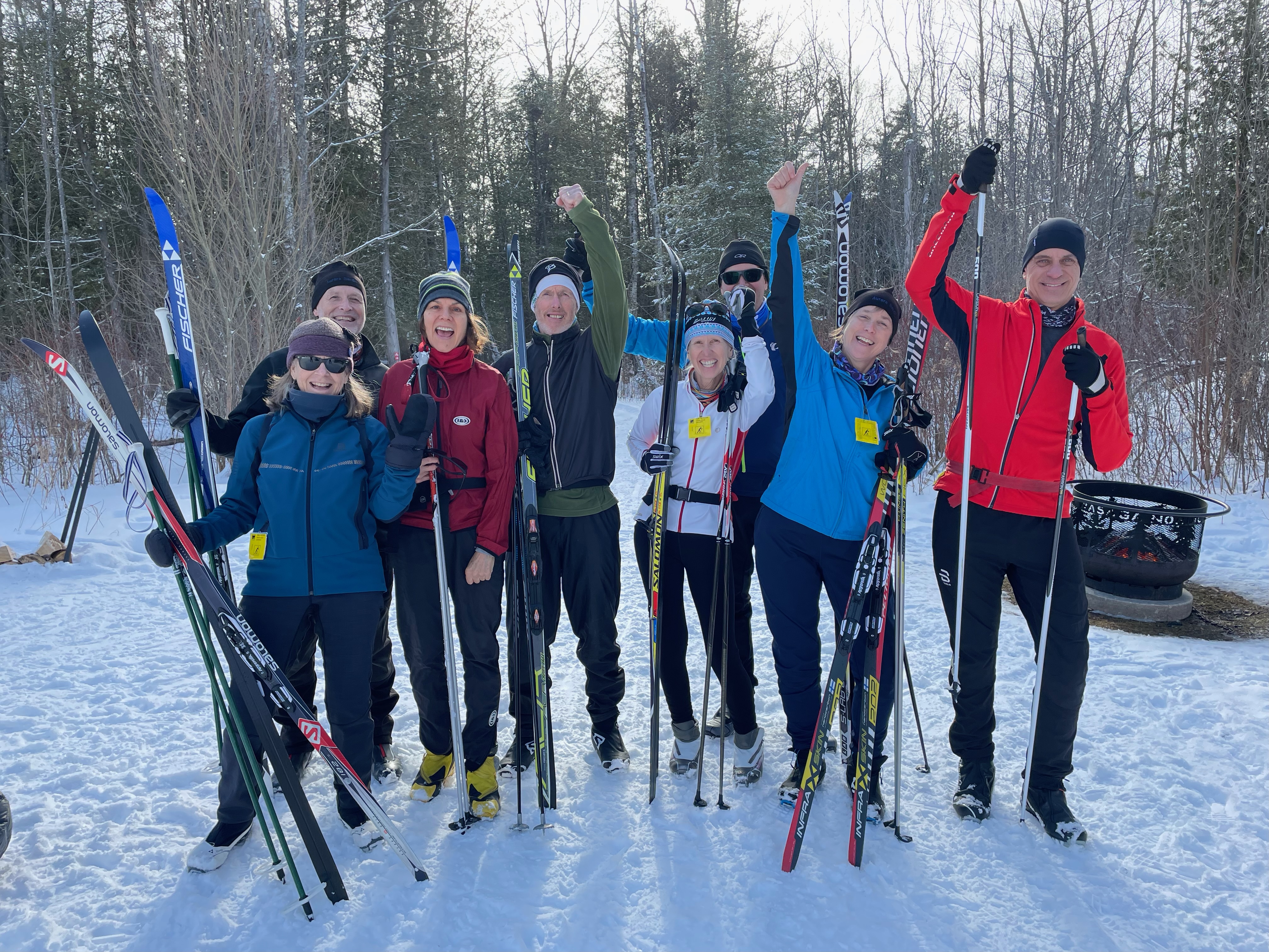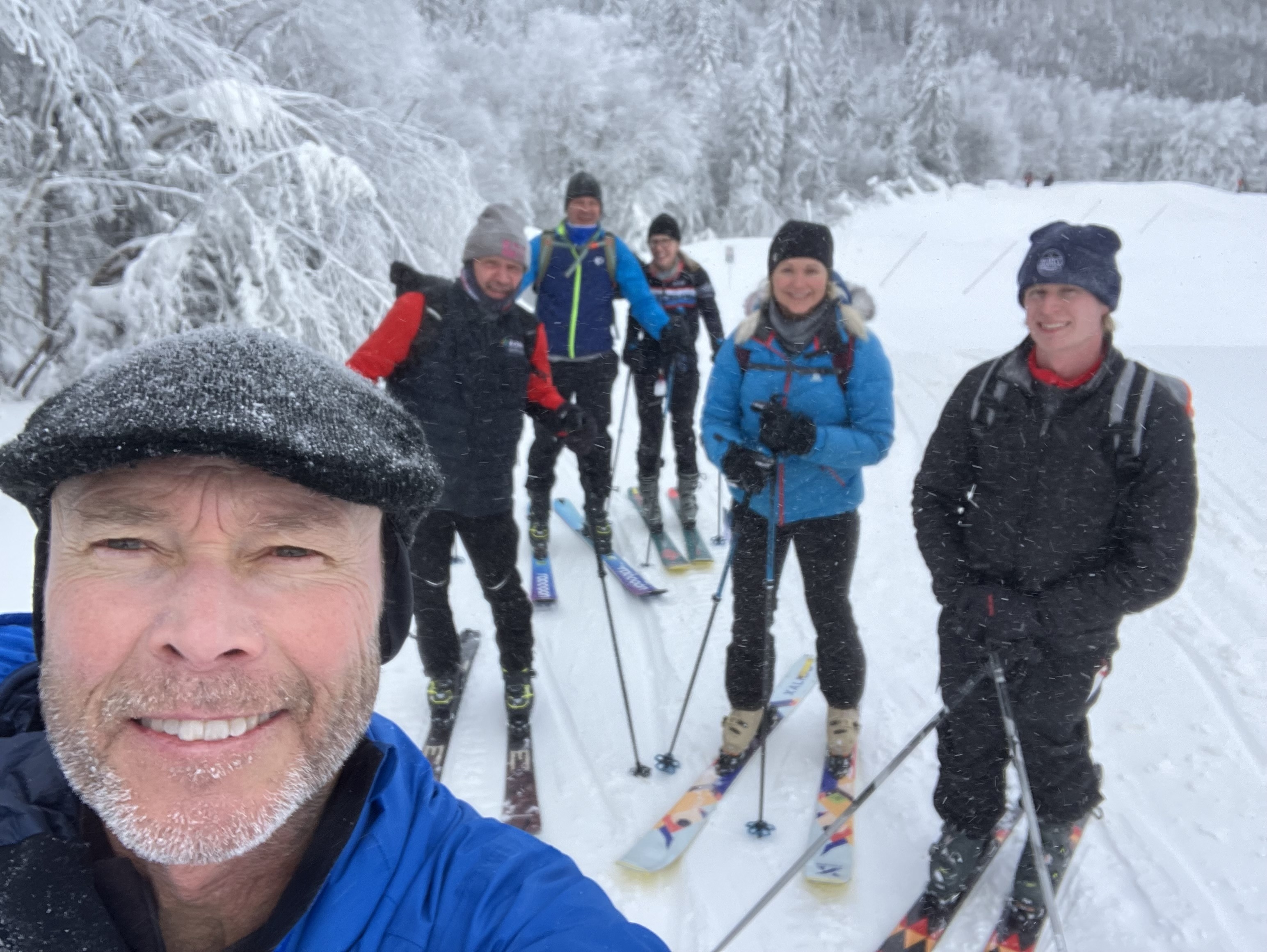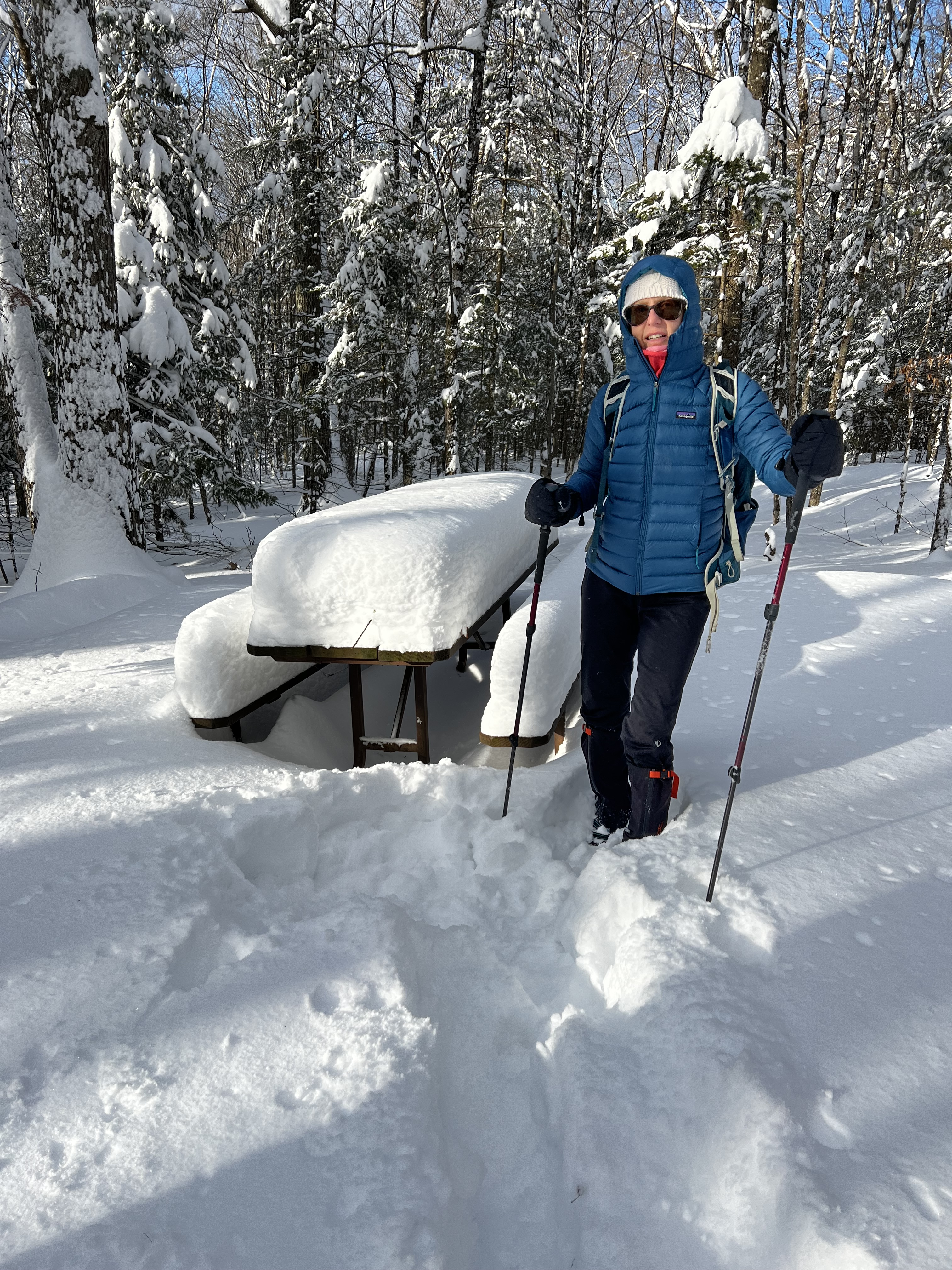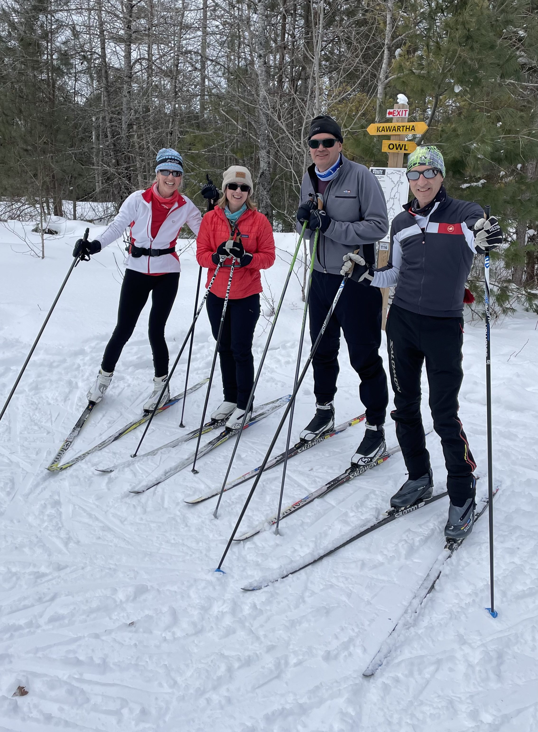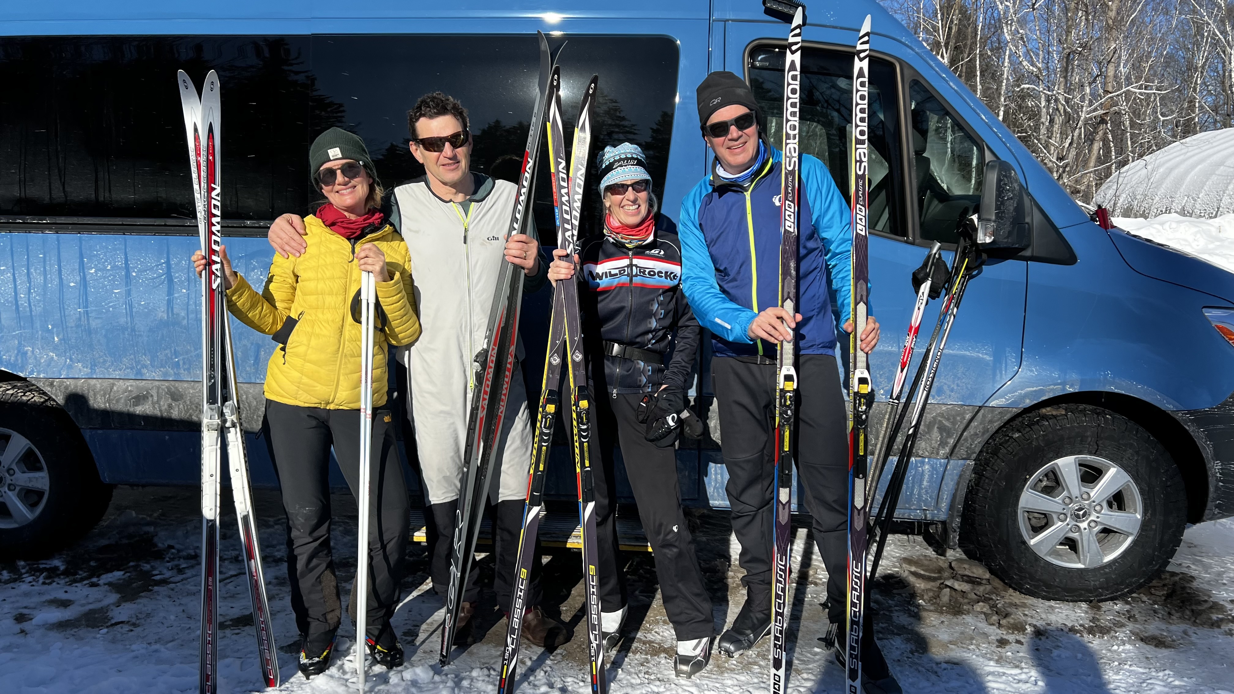 Overall, we had a great season exploring cross country skiing from the Sprinter van. The best ski months were February and March for South and Eastern Ontario. Overall we skied about 475km in 2 1/2 months and only scratched the surface. We do need to expand our ski area a bit more to southwestern Ontario’s snow belt: McGregor Provincial Park also offers Winter camping and skiing and Highlands Nordic near Collingwood is also very good. And then East of us there’s so much more: Gatineau Park and the Mont Tremblant area in the Province of Quebec. We did get a little sneak peak of the Tremblant area when our friends Dave and Lisa invited us to join their family at a rented chalet for a skiing weekend just after New Years. We were able to park our van in the driveway and join the fun dinner events with everyone. It was our first experience with alpine touring which Dave encouraged us to try and my first ever downhill. We rented equipment and walked up the ski hills with our skins – which seemed a bit crazy but perfectly doable.