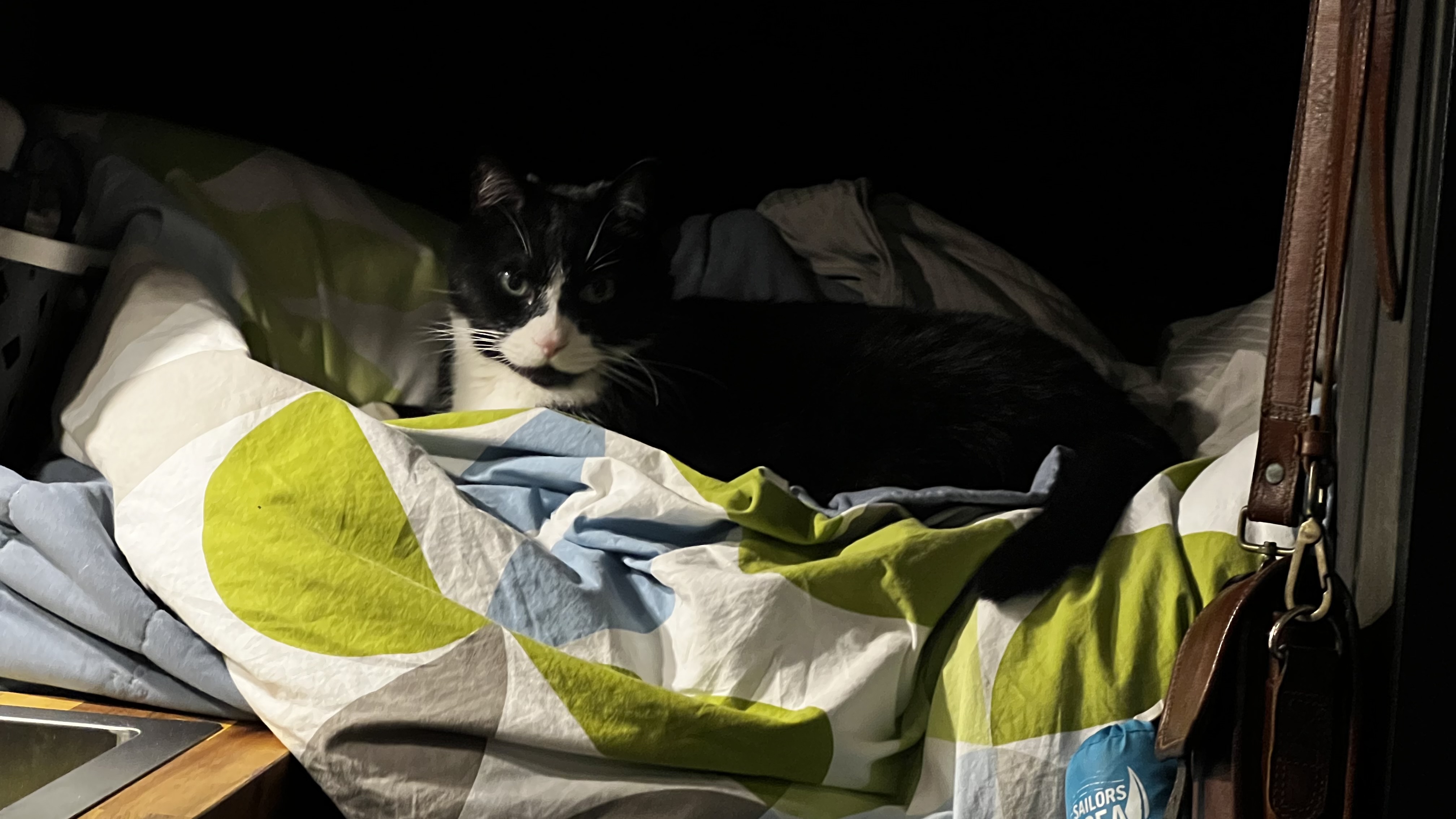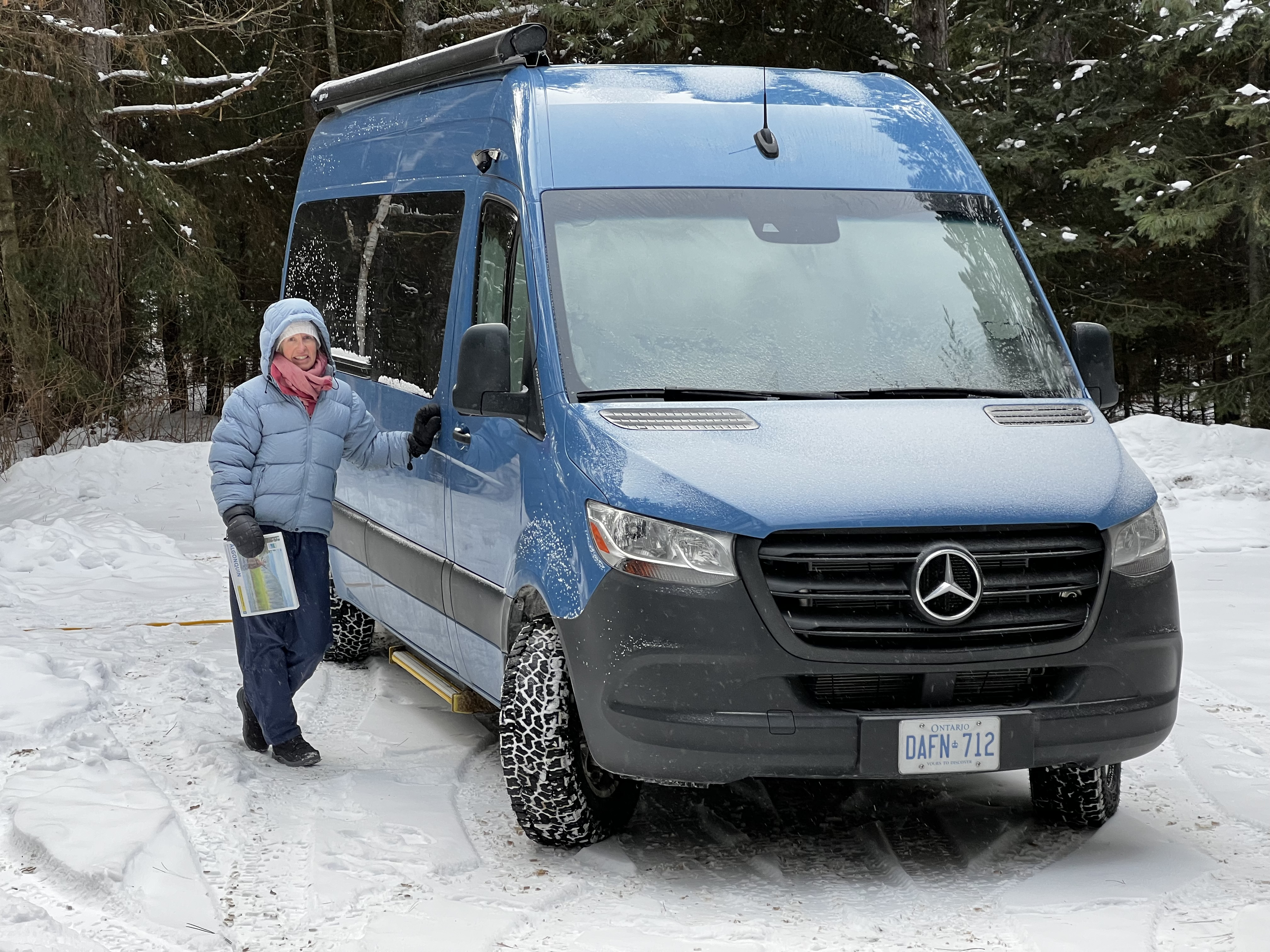 However, going through a Canadian Winter, even if it’s just in Ontario (no further north than Parry Sound) has been a bit of a learning curve. At home in our driveway we keep Big Blue plugged in all the time and ready to go. For now, we know we do have to plug in to keep it warm enough and keep the AGM battery bank topped up – solar is not enough in the winter, with our current set up. In future, we might switch to lithium and add more solar panels. But we have weathered our first nights at -29 Celsius and nothing broke and we were toasty warm. (3 small heaters for different spaces in the van, making sure the large garage under our bed, which holds the water tank and water heater, stays warm, and a diesel heater as back up.) Even Momo, our cat seems to approve, he likes the toasty van, but after a year on a sailboat, nothing seems to bother him anymore.