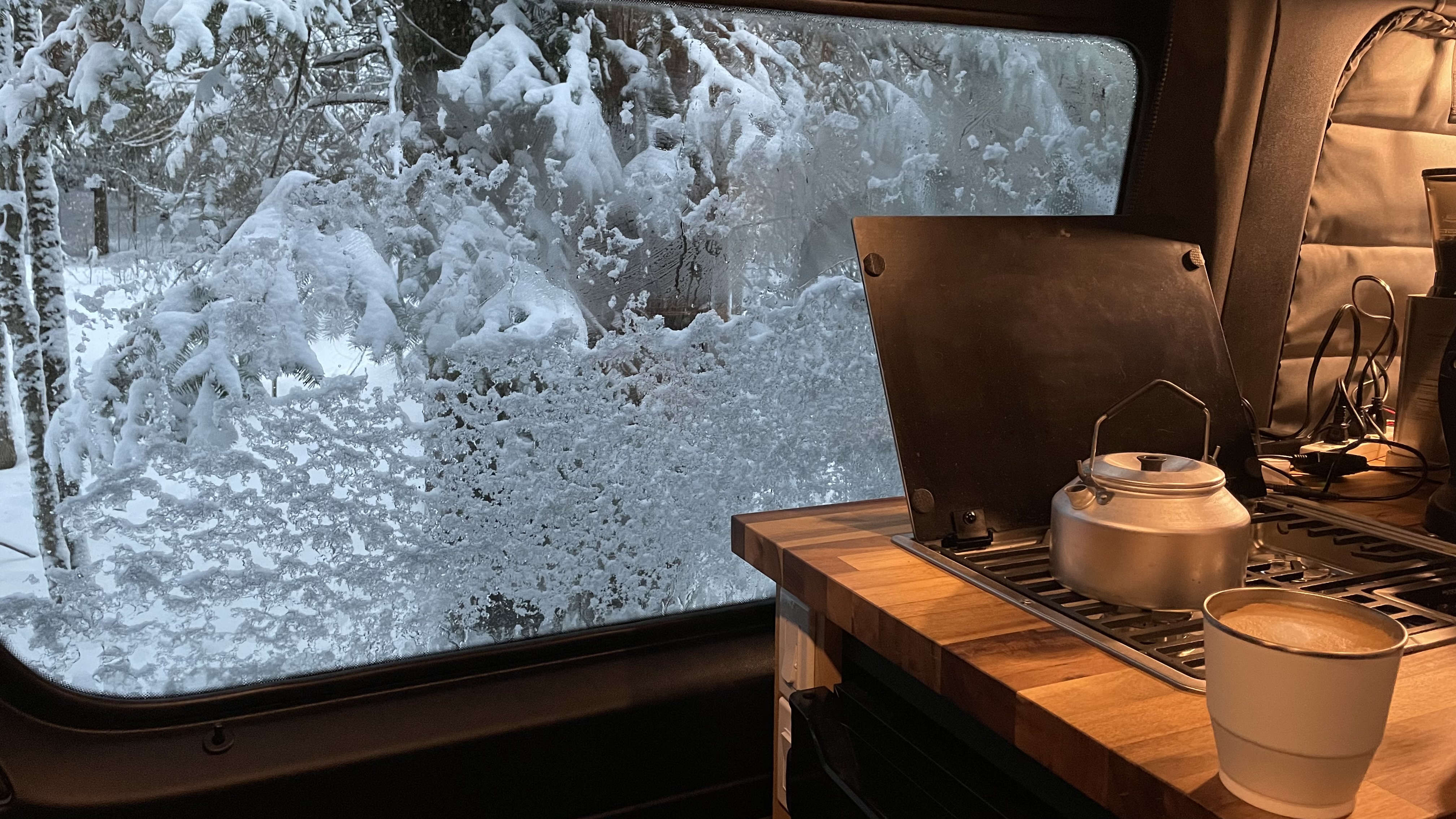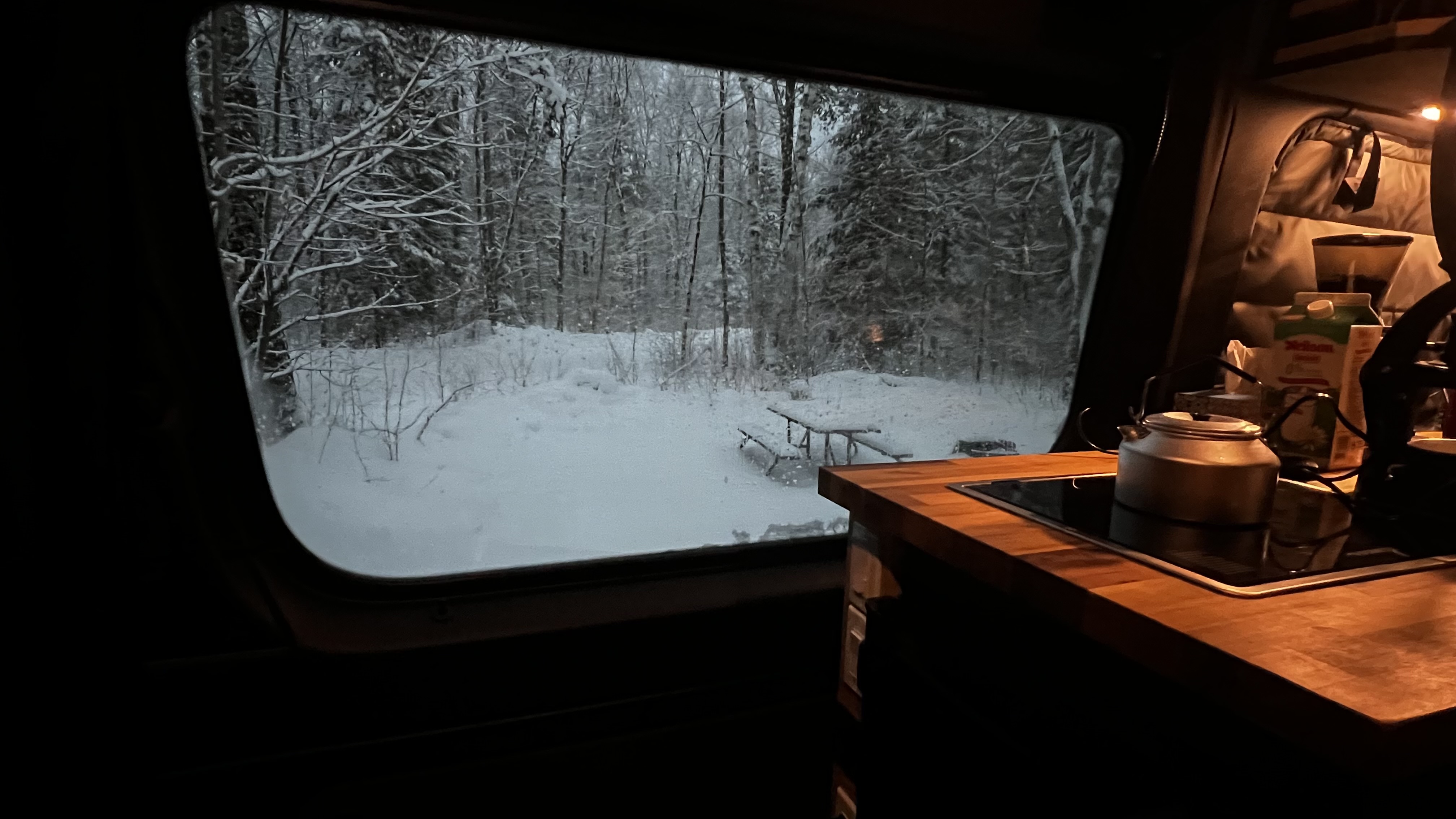 Now there’s traveling in an RV in normal temperatures with bug screens, you can leave windows and even doors open and feel like you are still camping. But, once you go below 0 Celsius it’s a different story, especially if you cherish the luxury of an indoor shower in your van, which we do very much. So our van has an inside water tank and can discharge grey water directly outside bypassing our grey water holding tank under the van. We have a Trelino “composting” toilet and a mostly insulated van.