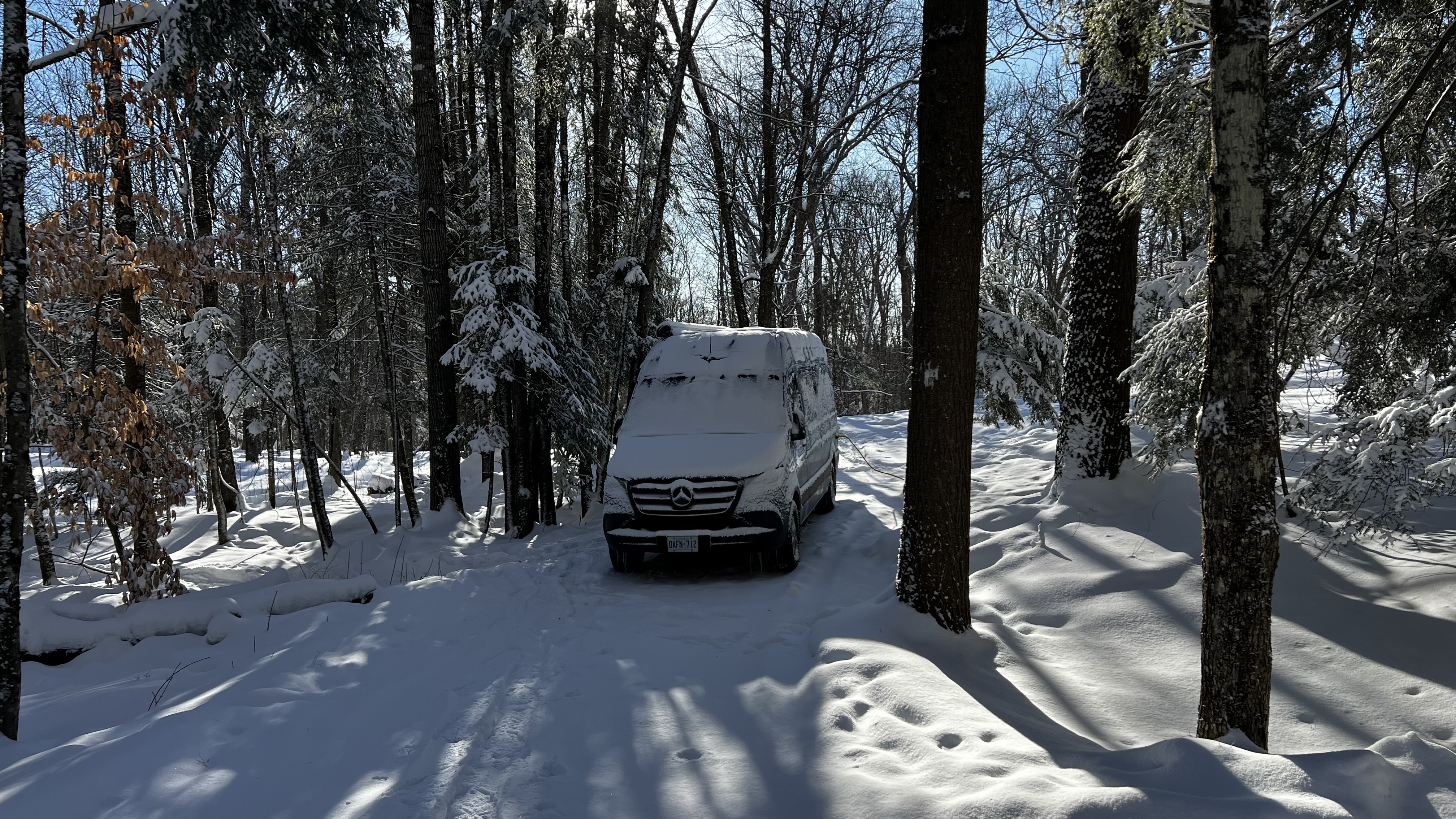 We tested “Big Blue” – that’s what we are calling our Sprinter right now – on a van/cycling trip down to North Carolina and Georgia in November 2024, where we hit some frosty mornings and the first snow storm of the season, so we thought we were mostly ready for the cold. We had also gotten a more aggressive All-Terrain Tire (Falken Wild Peak A/T4W) and a suspension upgrade (VanCompass Falcon adjustable rear shocks, sumo rear bump stops and the Baja Bracket rear shock mount) to have less sway and a more controlled ride especially on snowy roads. Our plan was not to go off road, but to stick to Provincial park camping in the winter and ski as much as possible.
