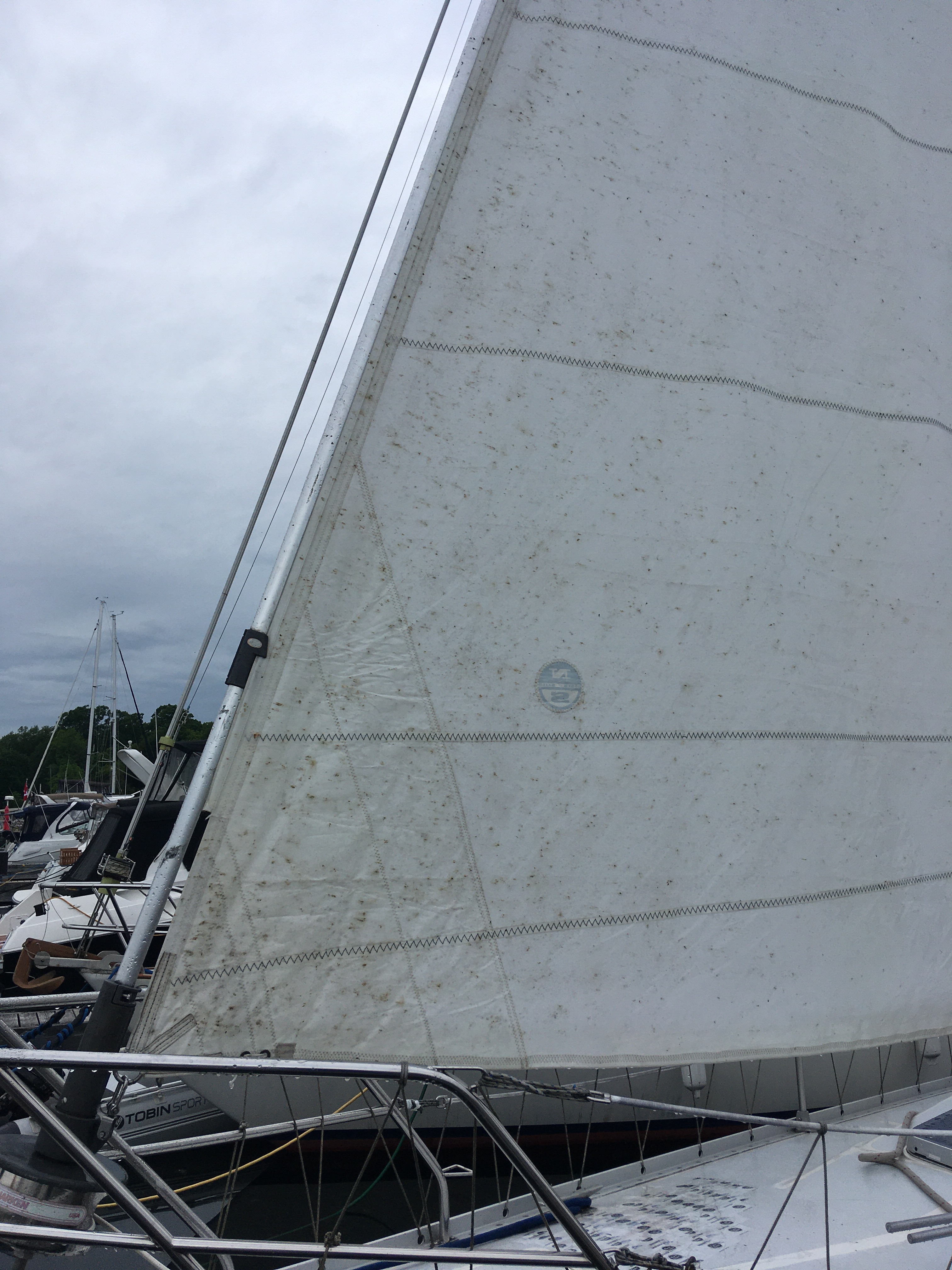 The next day we cut south through the Simcoe Channel on the western end of Wolfe Island and sailed along the southern shore of this pastoral Island with it’s many electric windmills. Stubbornly, we refused to start the motor for most of the way but paid for it by being invaded by the dreaded midges or Great Lakes flies which come out in swarms each May. They have the uncanny ability to hang onto all leeward surfaces on boats, especially sails – and then get squished into the dacron when you furl or lower your sails. Here’s a picture of our jib after I spend more than half an hour trying to dislodge the carcasses with a hose. Luckily, these are our working sails – not that we have any others!